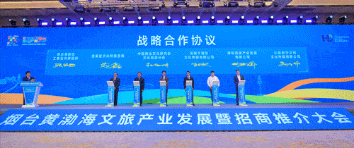 黄渤海新区工委宣传群团部与蓬莱区文化和旅游局和中国商业文化研究会文化旅游分会在本次推介会上签订了战略合作协议。