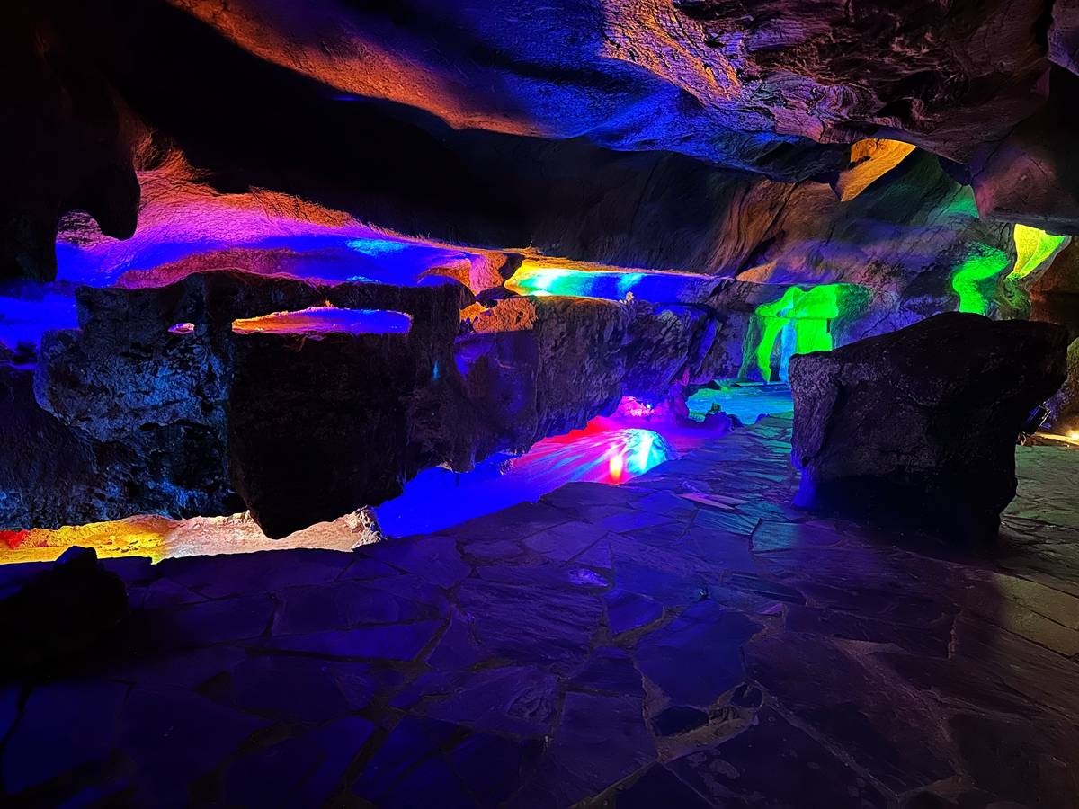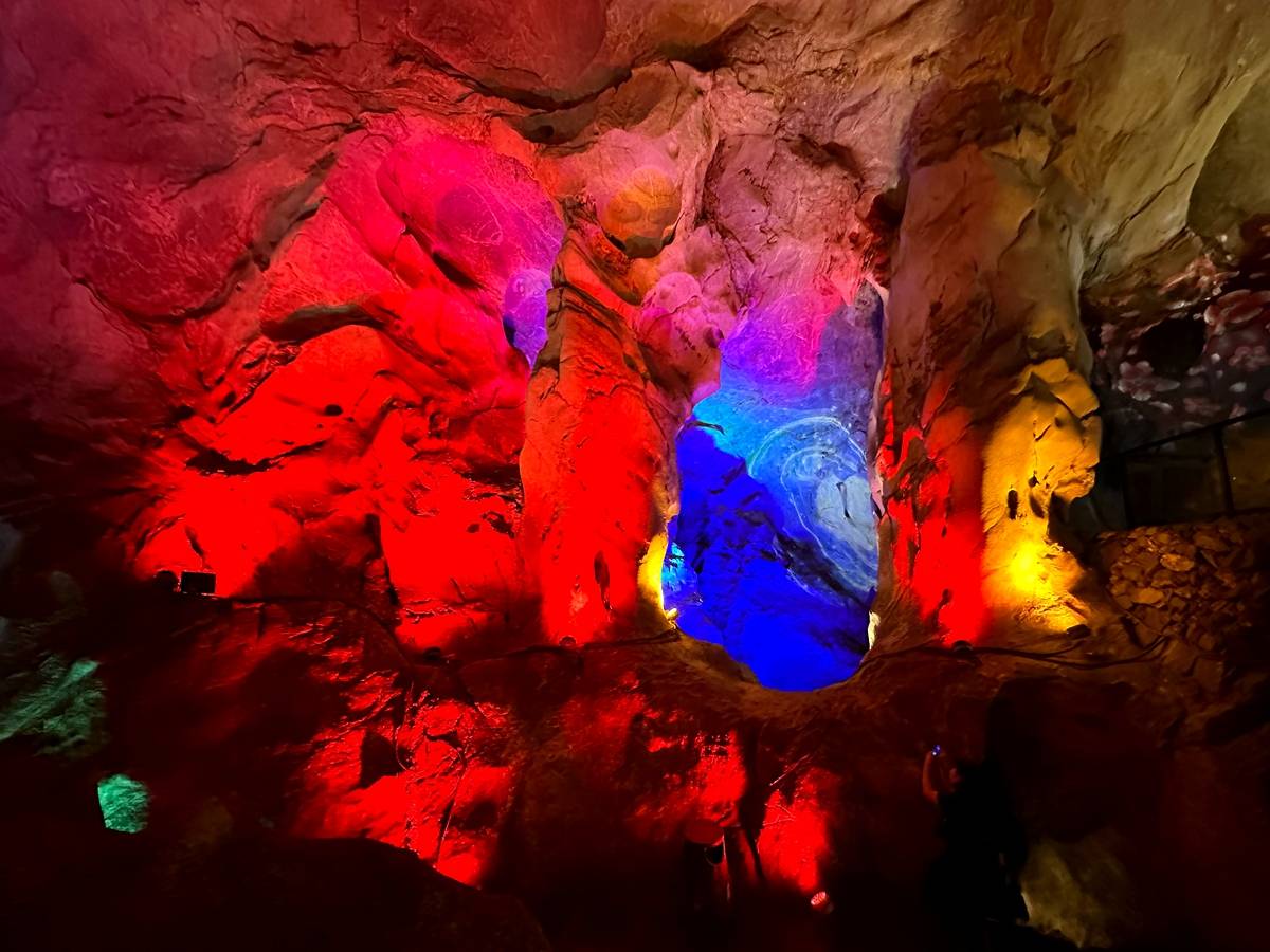 从来风洞而进,里面的气温和洞外差别很大,洞穴虽然深幽阴暗,但是并不潮湿,只是走至狭窄之处仍需侧身方能继续前行。和我之前去过的玉华洞相比,玉虚洞规模会小很多,尽管如此,它仍有它的独特魅力,这里因地因景安装各色彩灯照明投影,内有镇鲤石、龟蛇入洞、一线天、沉溪、天河、仙人床、洞底日月等千姿百态的景致,让人不禁感叹大自然的鬼斧神工。