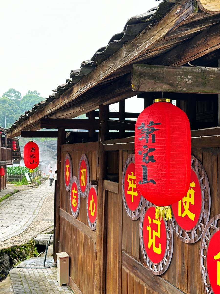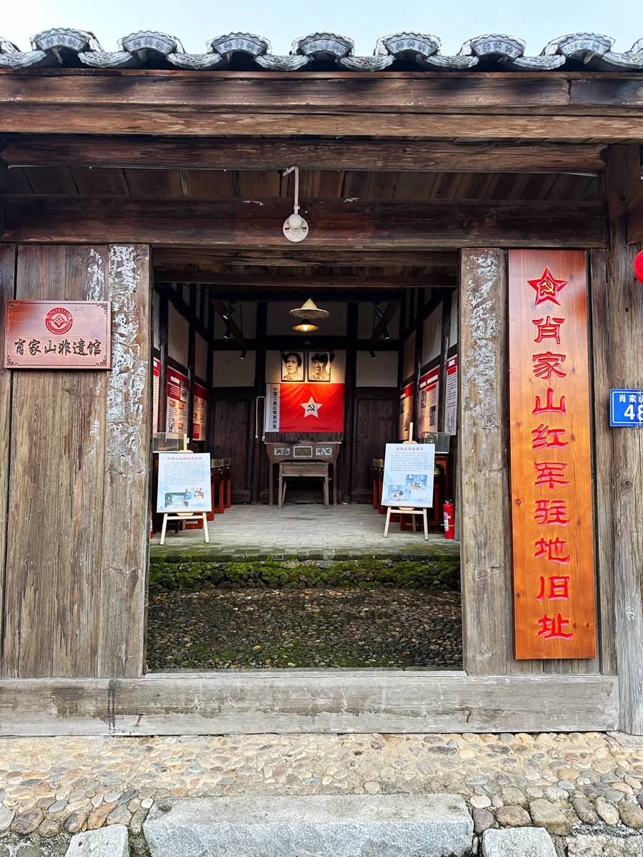 肖家山村的红色遗迹保存也比较完整,村内的非遗馆就曾是红军驻地旧址。据了解,自1931年6月至1934年10月,工农红军先后7次进驻胡坊,红四军十三师宋任穷、十九师肖劲光等红军将领多次到肖家山开展革命斗争,在岩头寨痛击国民党,至今岩头寨上关墙、堑壕、寨堡痕迹还依稀可辨。
