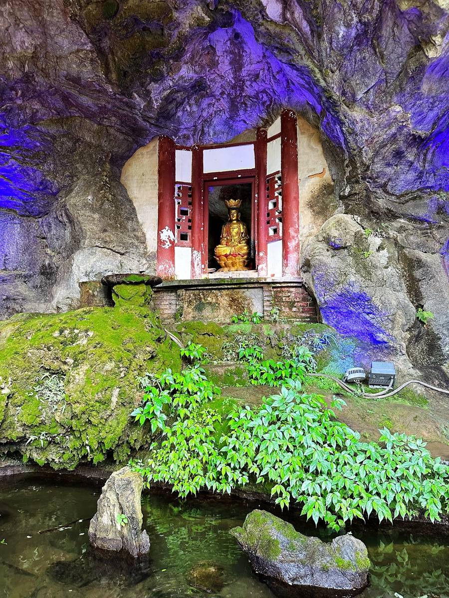 登上台阶便可以来到明洞前的观音殿,这里面积约100平方米,由左、中、右三根天然石柱支撑,内有天泉、斗狮、龟石、蜂窝、步月台等10多个景观。因明洞顶端终年滴水的奇观,所以玉虚洞景区也被当地人称为“滴水岩”。