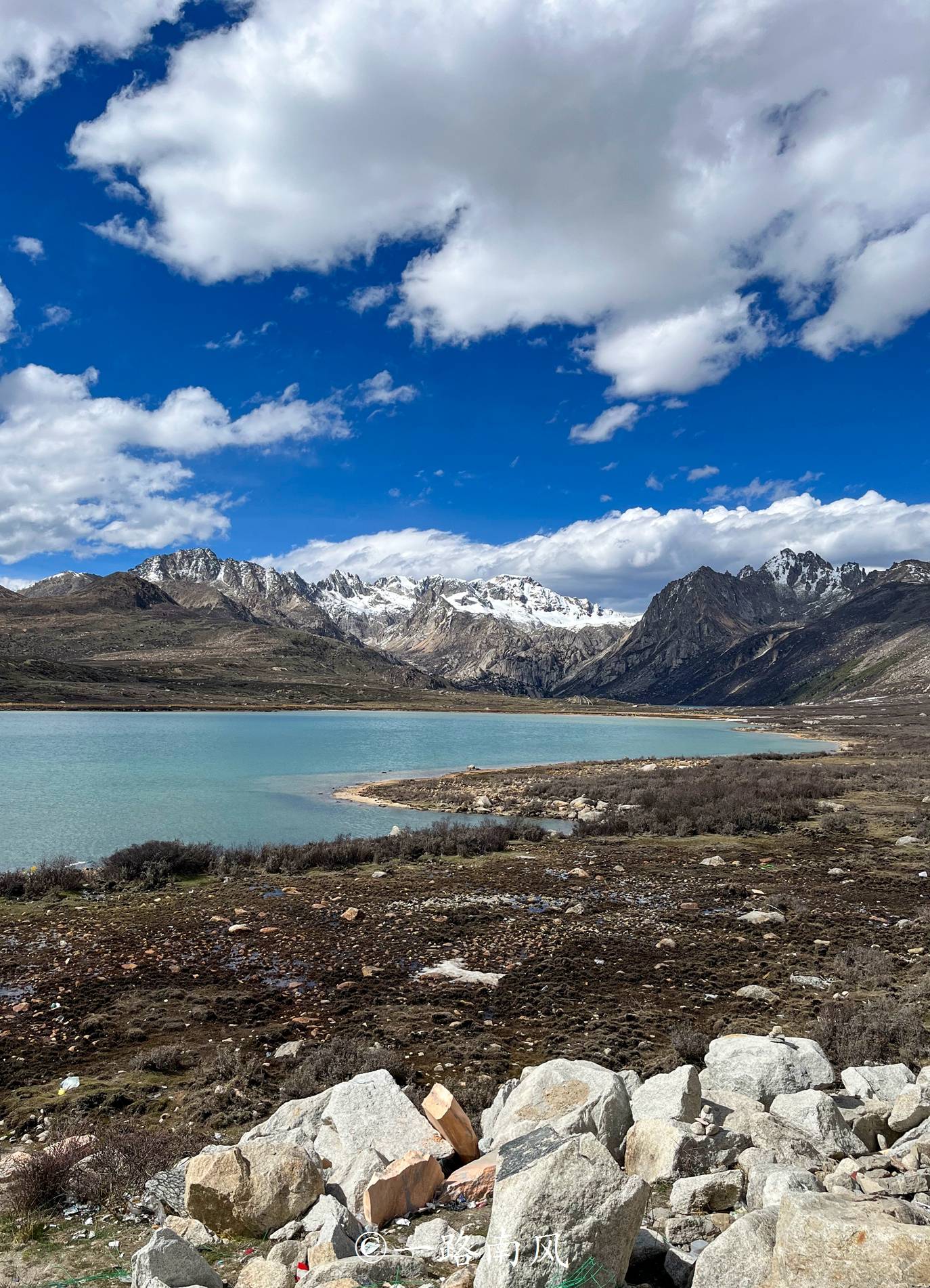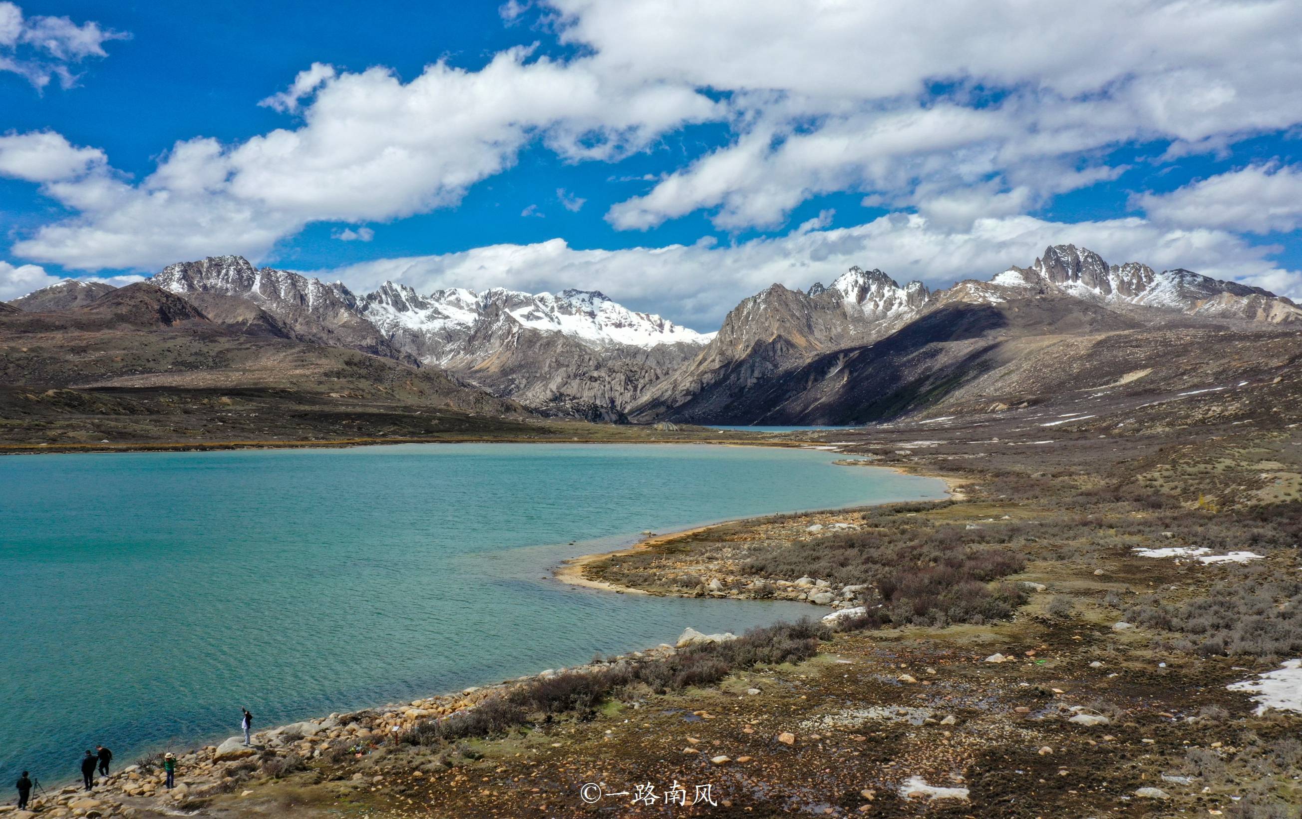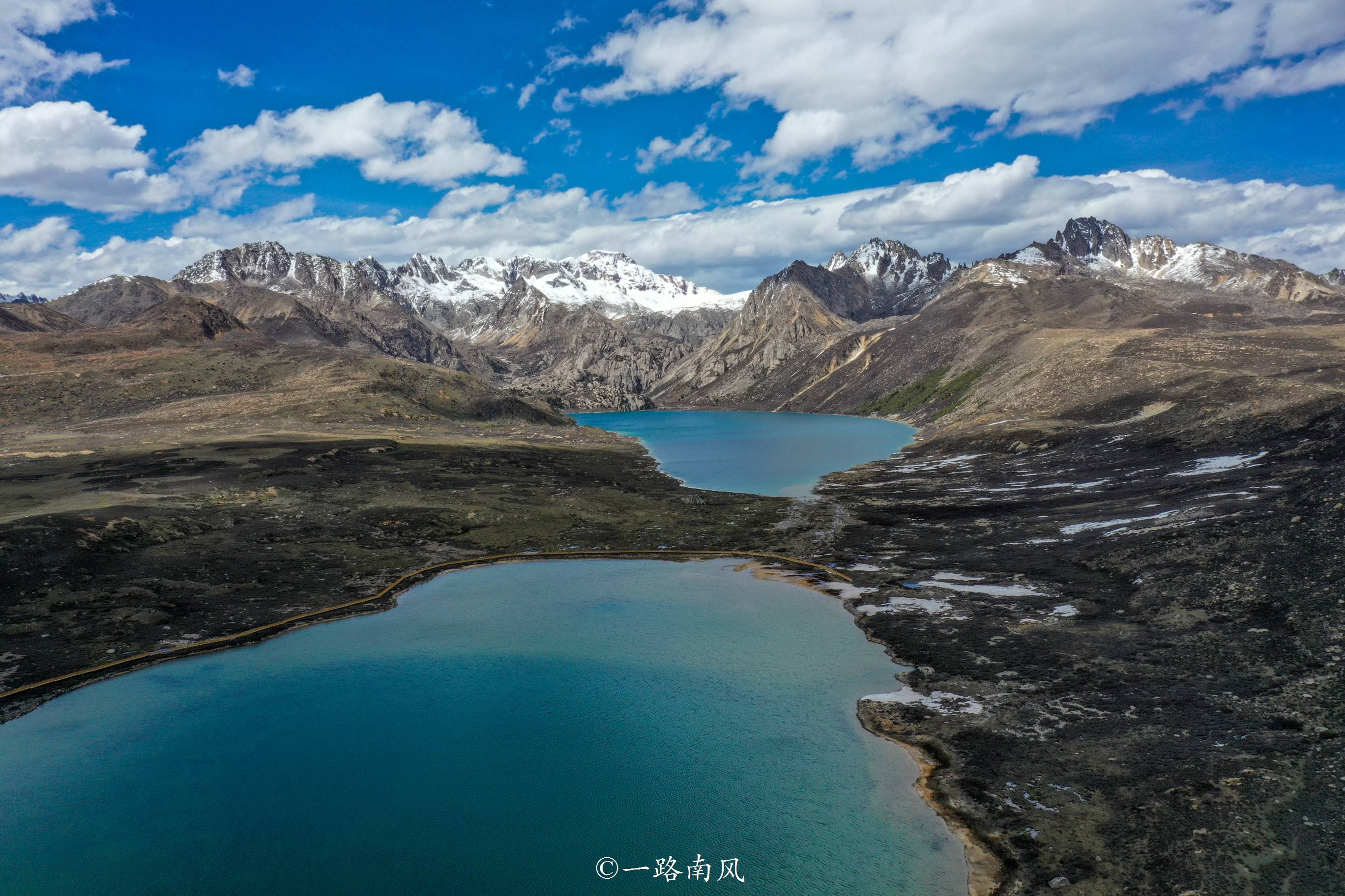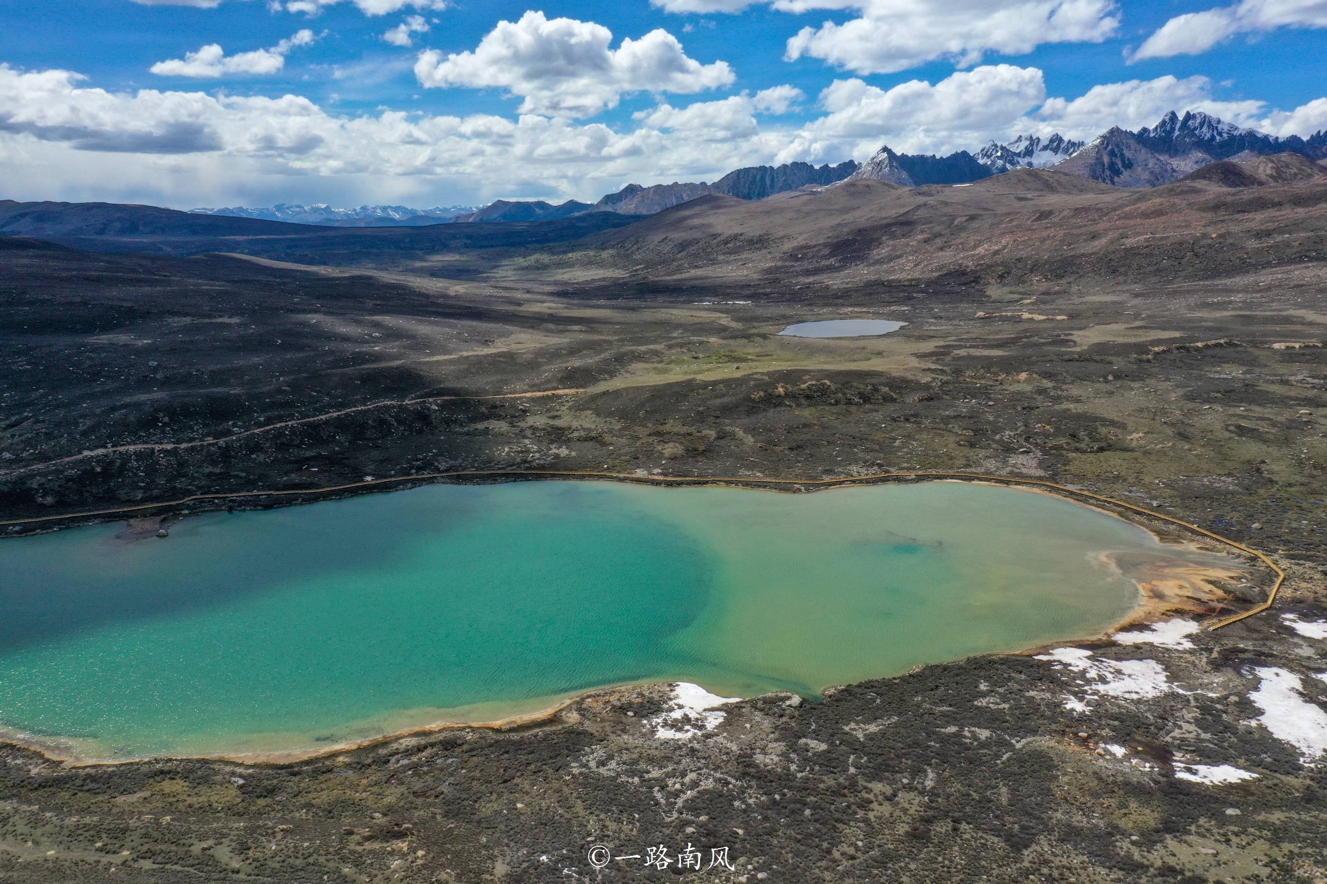 此前走318线进藏的时候已经看过一次姊妹湖,当时还是初春,湖面覆盖着厚厚的白色冰层,现在已是初夏,景色从童话意境转变为梦幻、瑰丽的蓝绿色调。