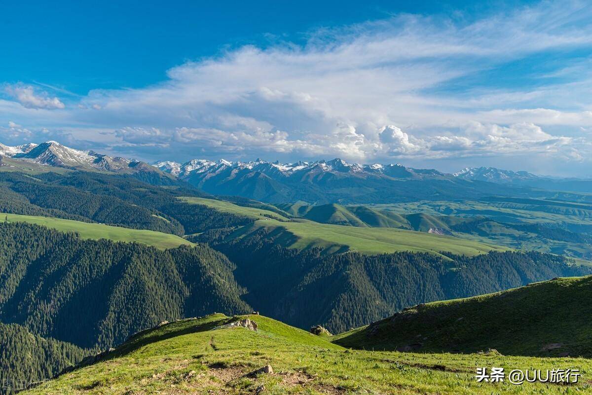 抵达山顶的天然观景平台,可以俯瞰伊犁的群山,远处的果子沟大桥、赛里木湖和延绵的雪山在一个画面里,吹着山顶凉爽的风,视觉和触觉都有着震撼。总之,这是一条入门级的越野穿越路线,适合想要挑战自己的旅行者,既有无人区的自然风光,又相对容易,足以满足你的越野征服感。