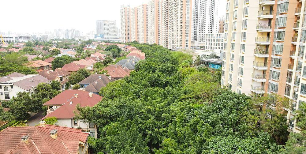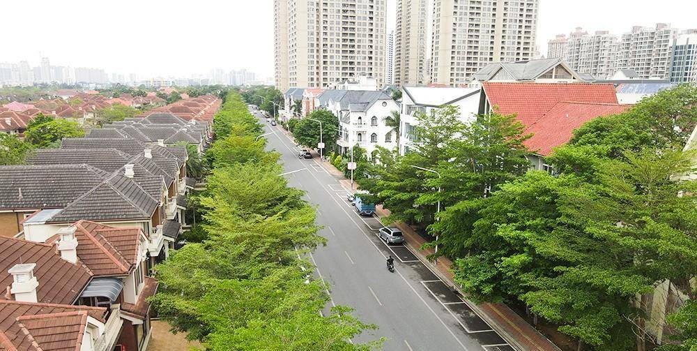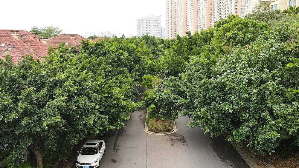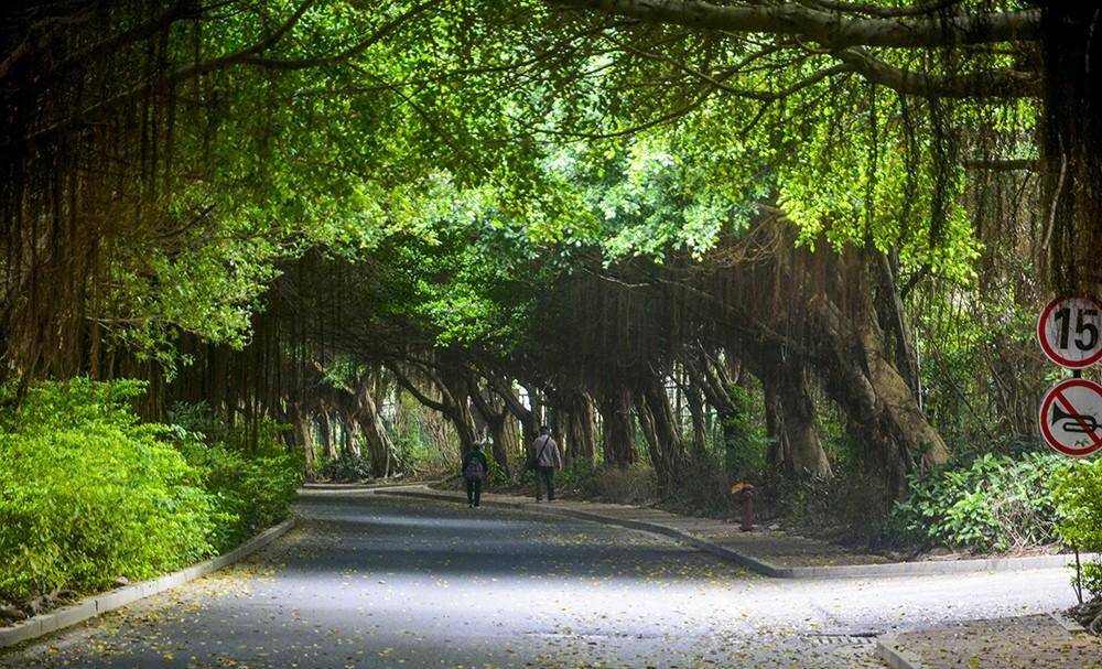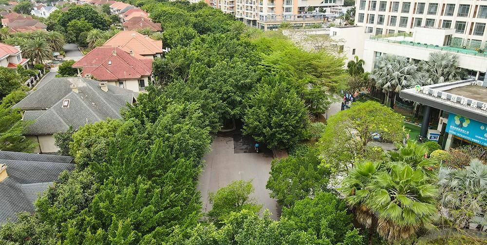 银滩二号路最漂亮的一段路就是西段种植小叶榕树一段。这段银滩二号路,甚至要比西藏路或者北部湾路还“遮天蔽日”。因为这段路,不是种植两排榕树,而是三排榕树。加上银滩二号路并不宽,所以,通过航拍, 你会发现,根本看不到路在哪里,只有一片绿而已。