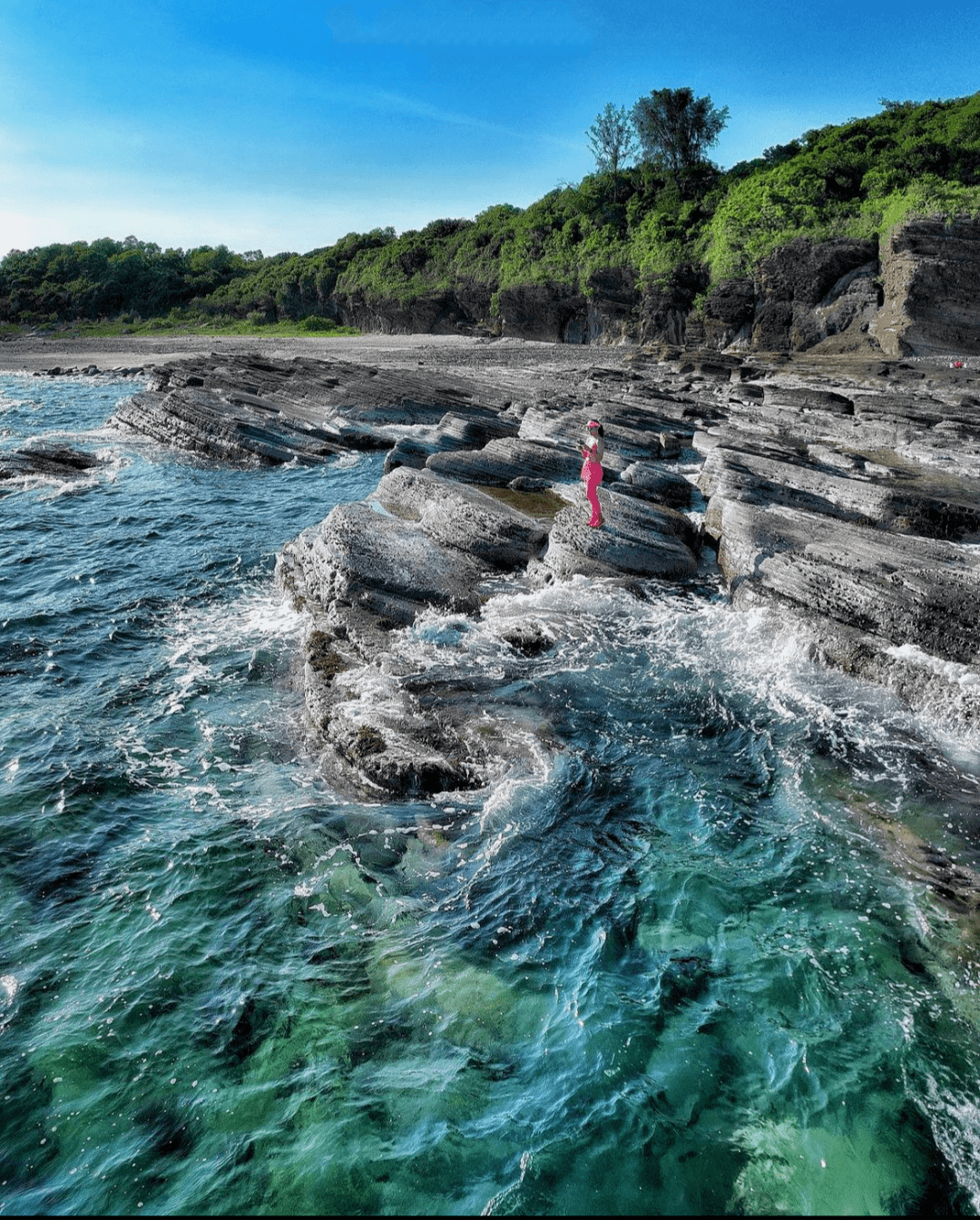 它有两个很特别的元素,一个是像菠萝包一样的岩石,另一个就是上图你们看到的,海上的天然沙石堤。
