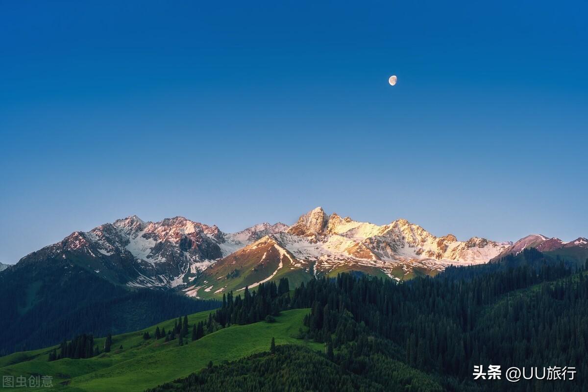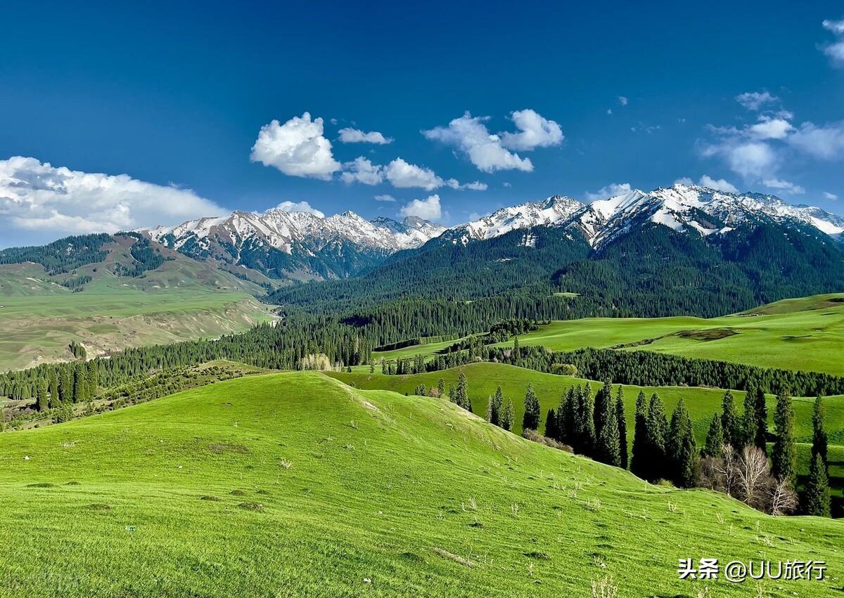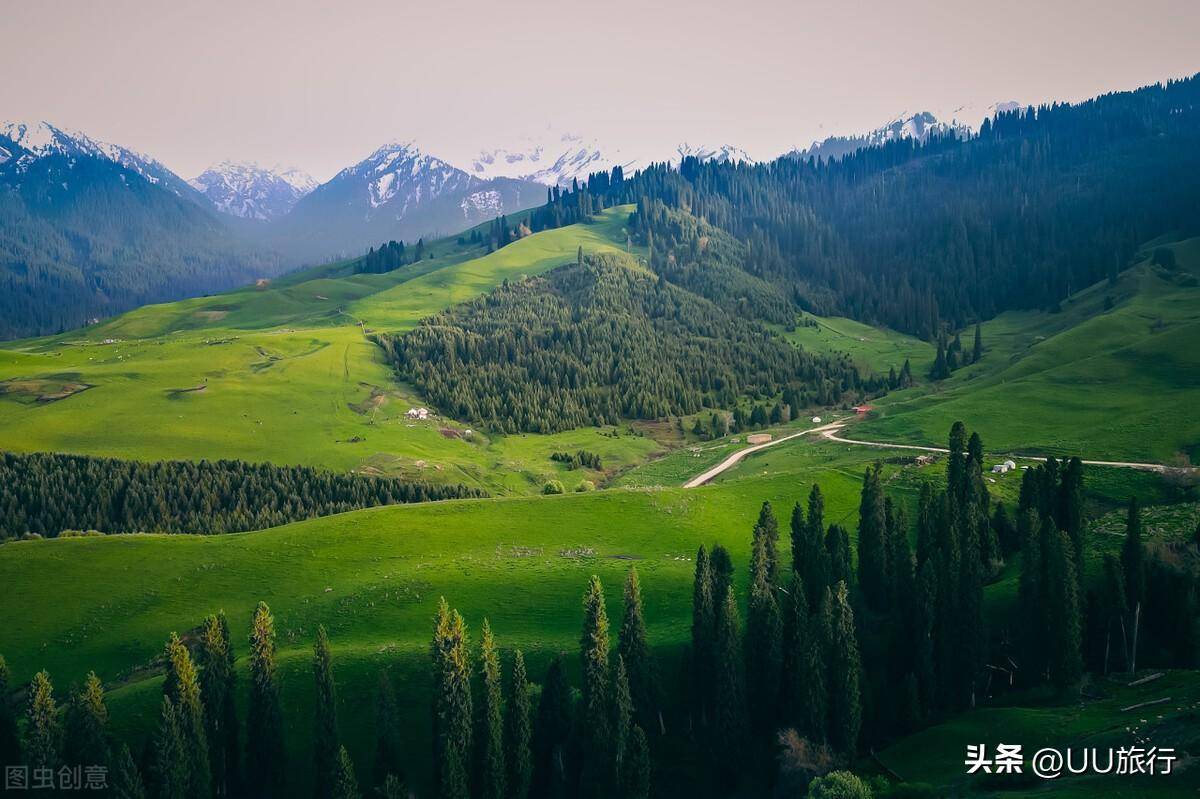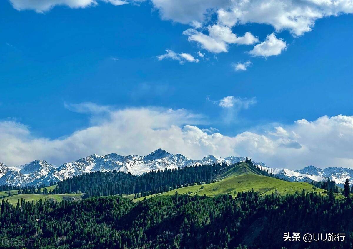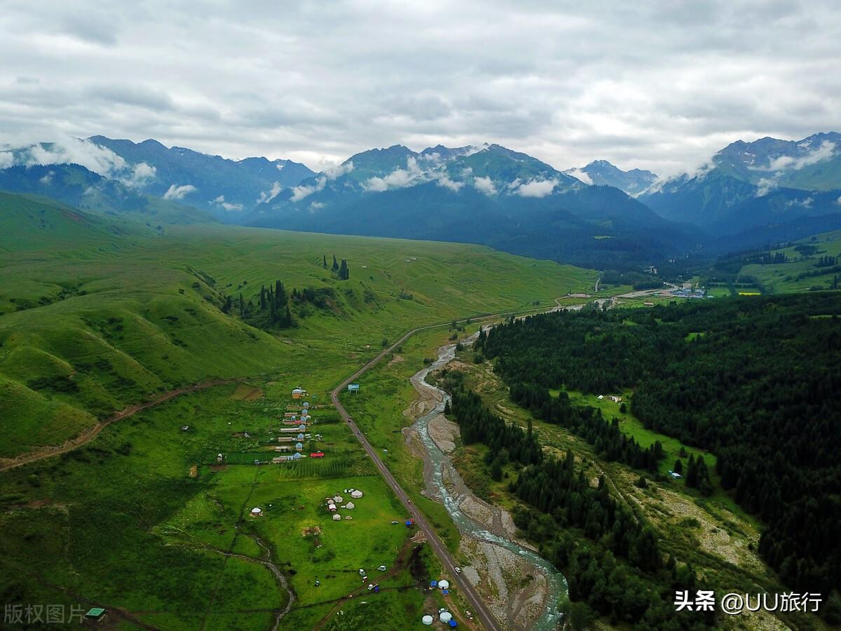 开着车,沿着被云杉包围的小路,一直到达山顶,远处巍峨的雪山,近处起伏的草原,峡谷溪流,汇成了这片极致的草原风景,像是一个浓缩版的伊犁。作为一个没有流量热度的小众景点,即便在今天火爆的旅游旺季,也几乎很少能看到成群的游客。