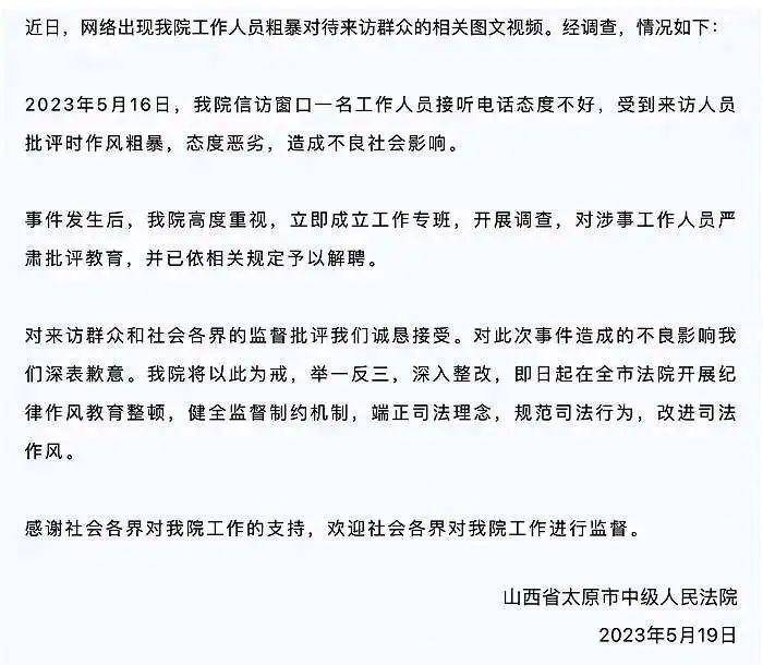 最近,网络出现山西省太原市中级人民法院工作人员粗暴对待来访群众的相关图文视频。太原中院官微发布情况通报称“该院高度重视,立即成立工作专班,开展调查,对涉事工作人员严肃批评教育,并已依相关规定予以解聘。”云云。