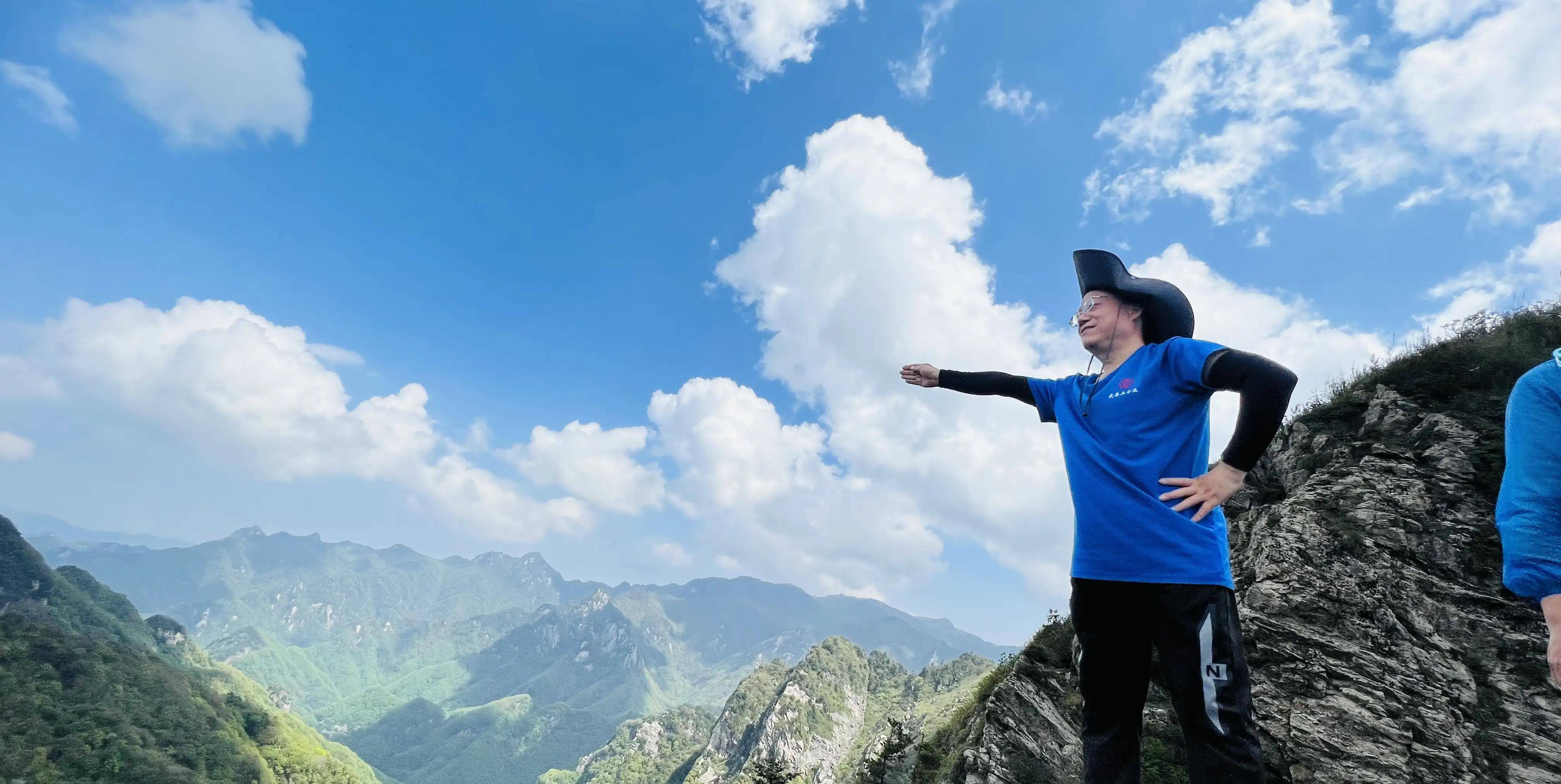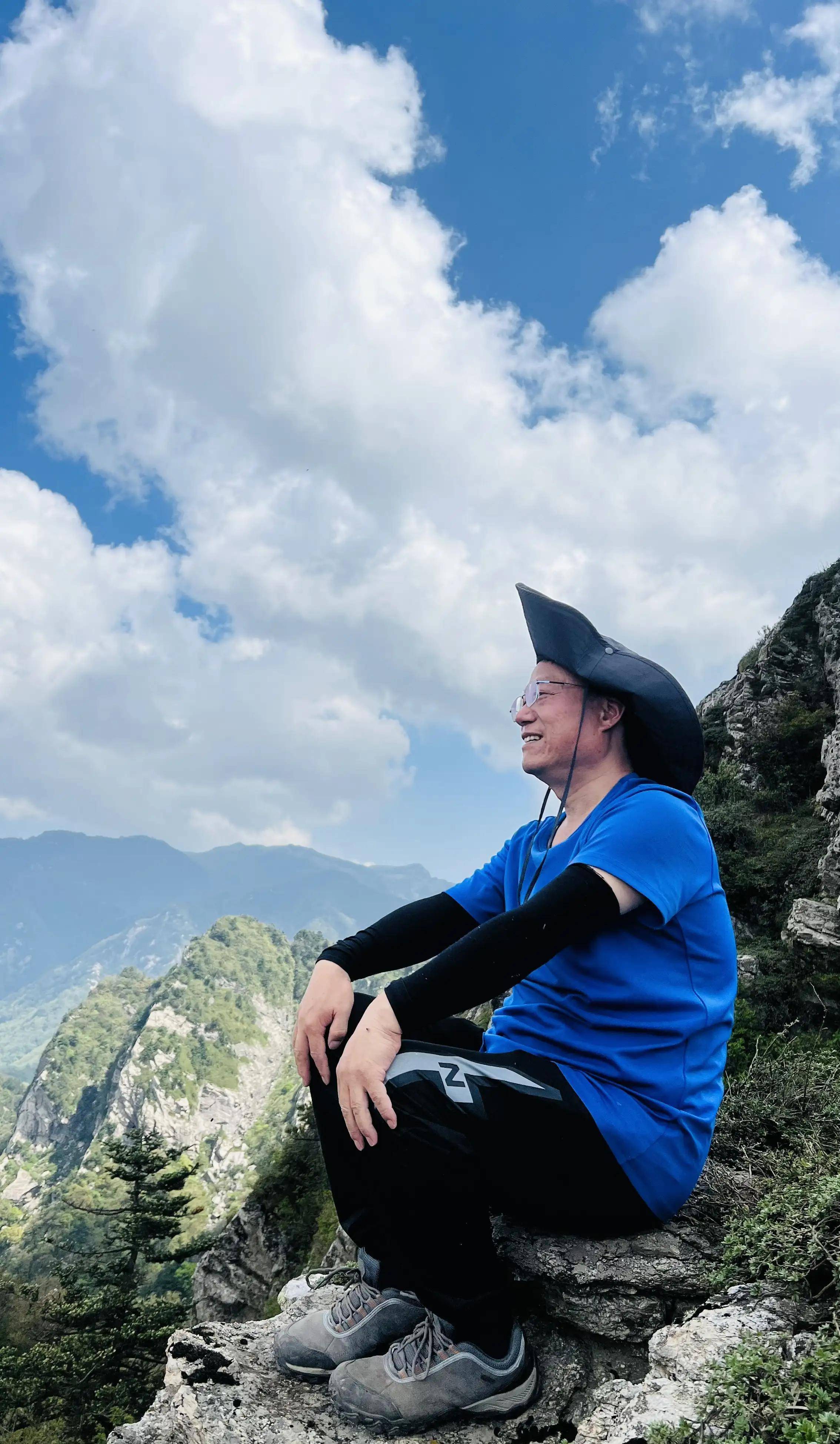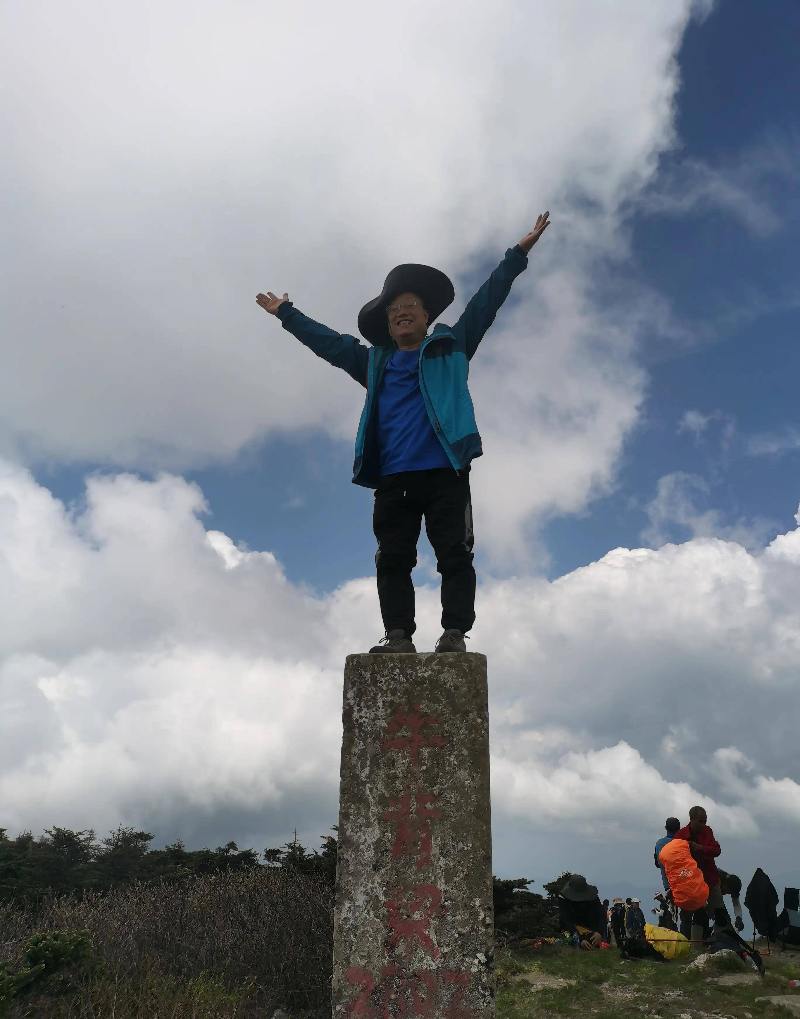 1点20分,经过4个多小时的奋力攀爬,我终于登顶了。在这个打卡网红地,人们排着队拍照。我也站立在这个石柱上,伸展身姿,拥抱2802米的空气,登顶揽胜的喜悦洋溢在脸上。我双手掬着朵朵白云,畅想着如果我能幻化成一只大鹏,扶摇直上九万里,揽尽人间五月天,那将是一件多么痛快的事呀。
