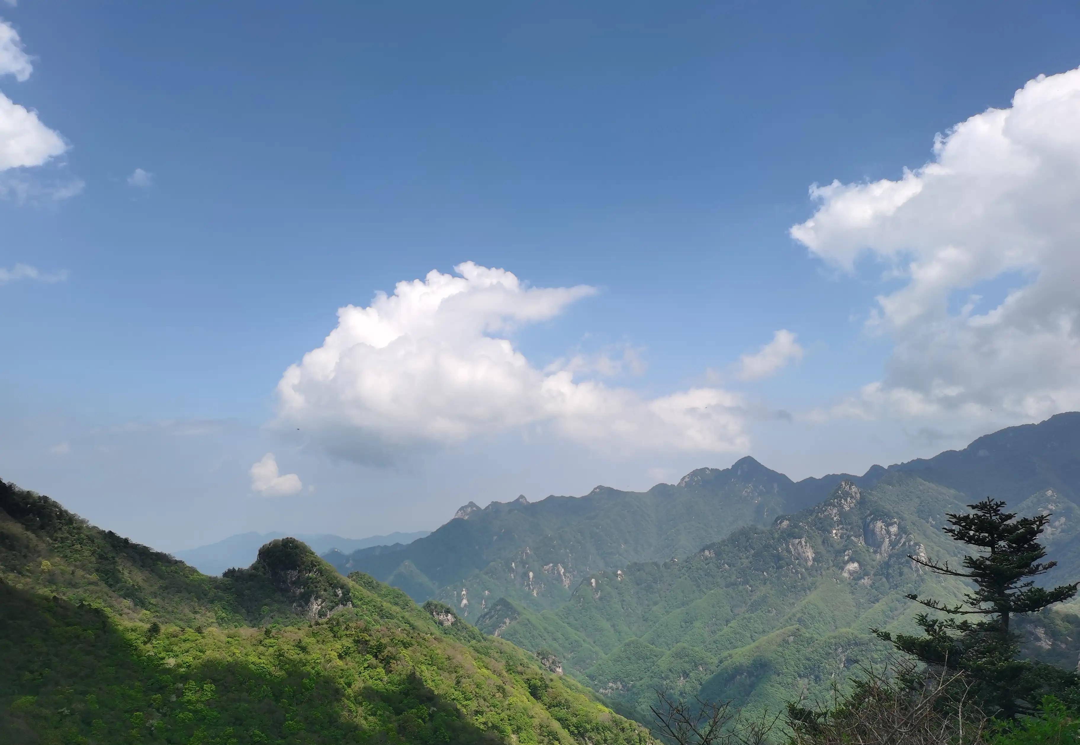 11点时,连翻三座山头,汗已湿透衣背。稍事休息。向左手方望去,苍山翠绿,远处的天蓝得深邃,朵朵白云像棉絮样洁白,在山巅飘荡。蓝天白云微风翠山,一切如此祥和美好。我被如此美好瞬间吸引,竟忘记了前行,一直呆呆的看着。真想越过重重峻山,去领略各处的秀美。