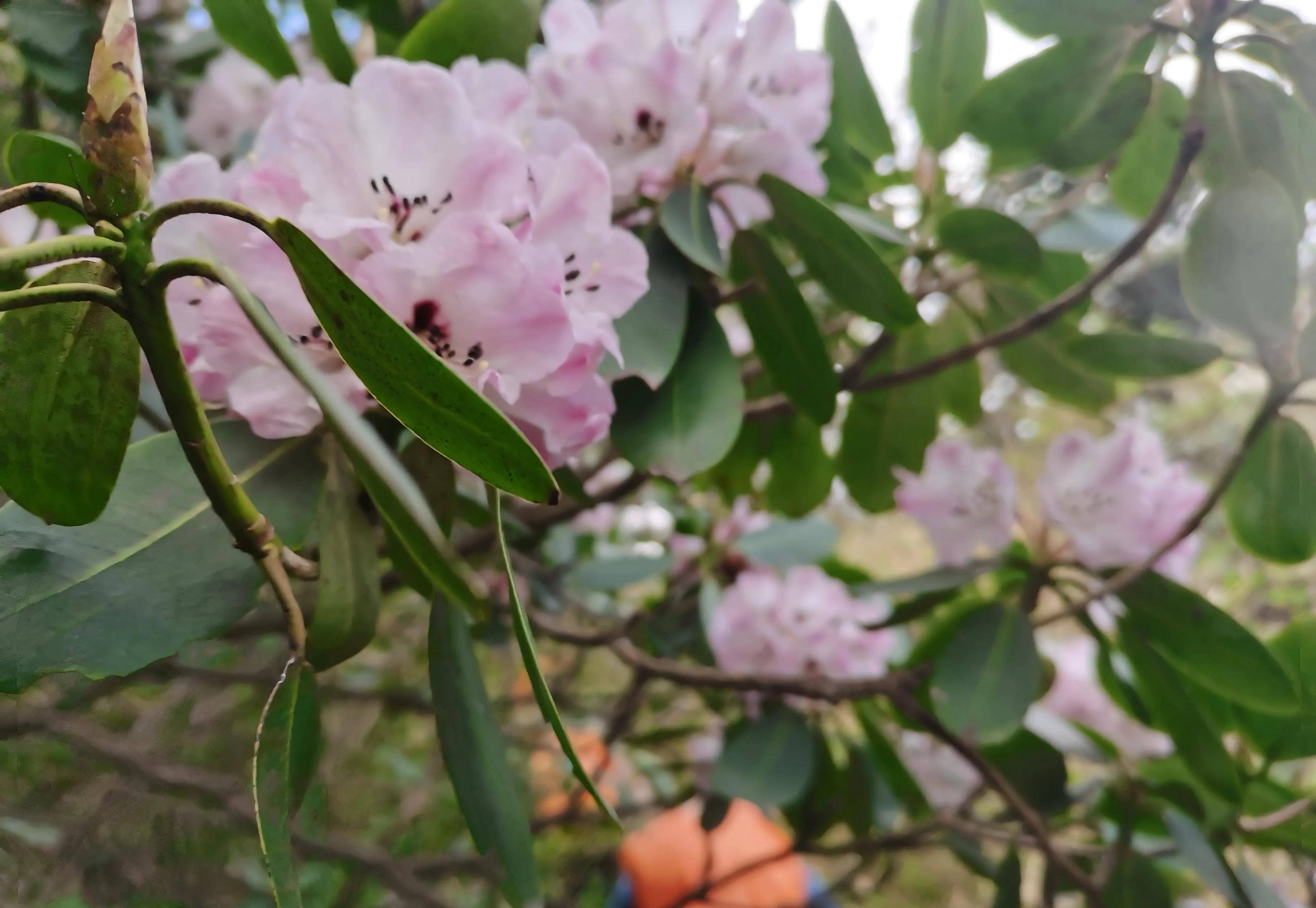 沿路边零零散散的乔木杜鹃也开的正艳。团团簇簇的花朵娇艳欲滴,粉色的杜鹃更娇艳妩媚,大家纷纷选择角度拍照留念,并爱怜的欣赏嗅嗅。有位驴友竟然狼吞虎咽杜鹃花,吃的有滋有味,并说花味是甜的。但他随后又说了句,明天四医大见。让人揣摩不透,究竟杜鹃花能吃还是不能吃。