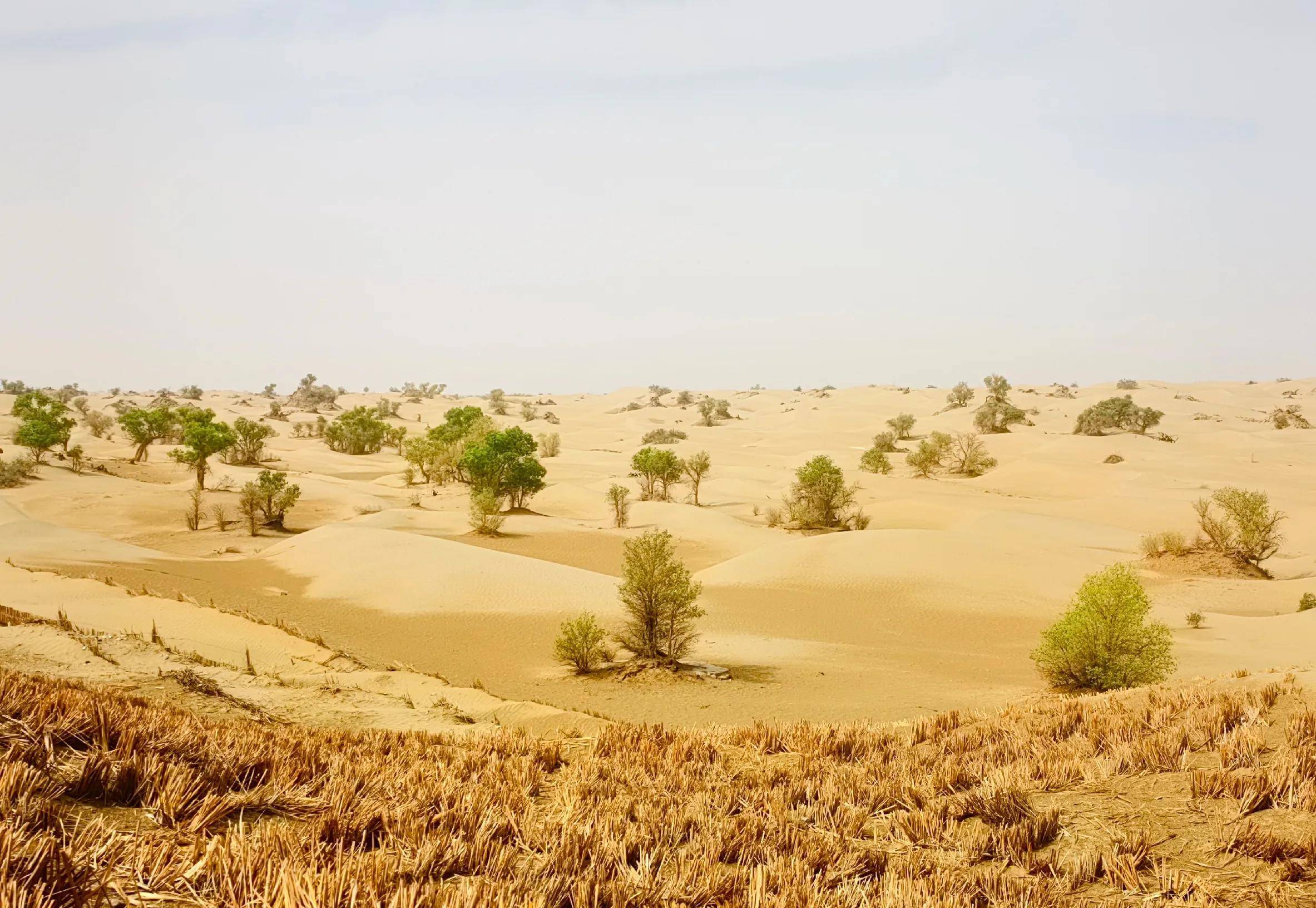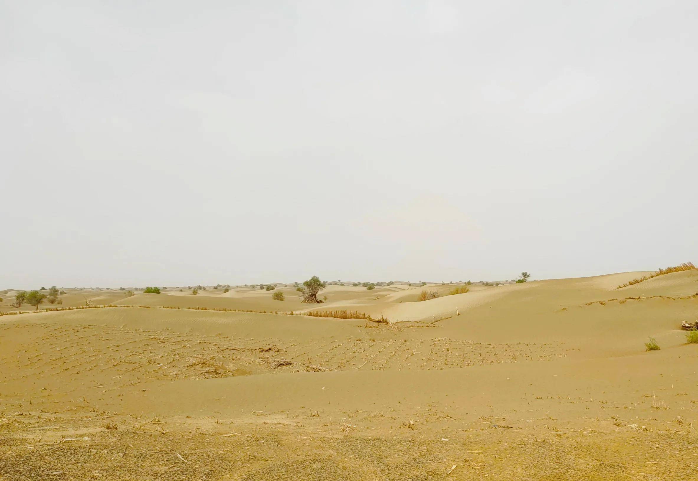 雨后天晴,微风不燥,湿水的沙,起不了尘,远处胡杨林绿着,竟有些春和景明的模样,真是难得。