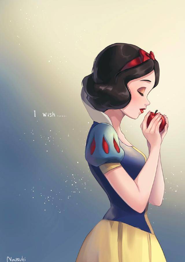 作为迪士尼最早登场的一位公主,白雪的形象一直是身材小巧玲珑,长相甜美心地善良。因此很多观众都被童话中白雪那股“纯真少女”的气质的所感染,而手绘风下的白雪依旧保持这股纯真气息,手握小小的红苹果在悄悄祈祷的样子,仿佛整个世界都瞬间静止下来,恬静美丽得让人难以忘怀!