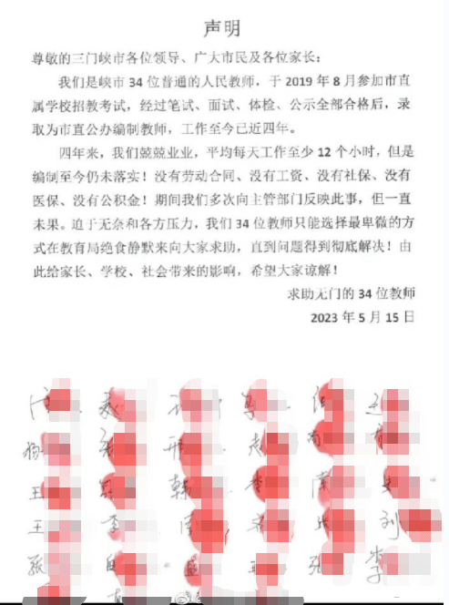 近日,有网传消息称河南三门峡市34名教师发布公开声明,称他们从事教师工作4年,且均被录取为“公办编制教师”,但4年过去编制却并未落实。