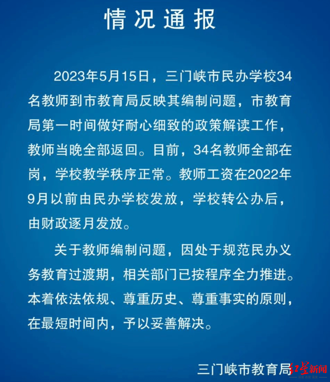 5月22日,三门峡教育局就此事发布了情况通报,5月15日三门峡市民办学校34名教师到市教育局反映其编制问题,市教育局第一时间做好耐心细致的政策解读工作,教师当晚全部返回。目前,34名教师全部在岗,学校教学秩序正常。 教师工资在2022年9月以前由民办学校发放,学校转公办后,由财政逐月发放。关于教师编制问题,因处于规范民办义务教育过渡期,相关部门已按程序全力推进。本着依法依规、尊重历史、尊重事实的原则,在最短时间内,予以妥善解决。