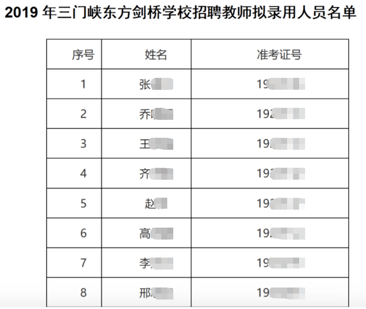 同时,记者也在三门峡教育局官网看到,2019年8月,教育局对外公布了《2019年三门峡东方剑桥学校招聘教师成绩公告》。据记者不完全梳理,该成绩公告中共有289人,对比网传截图中34名教师的签名,记者在该成绩公告中找到了至少20名教师的公开成绩。在该校2019年12月26日公布的《2019年三门峡东方剑桥学校招聘教师拟录用人员名单》中,网传图片中33个签名与这份录用名单相同。