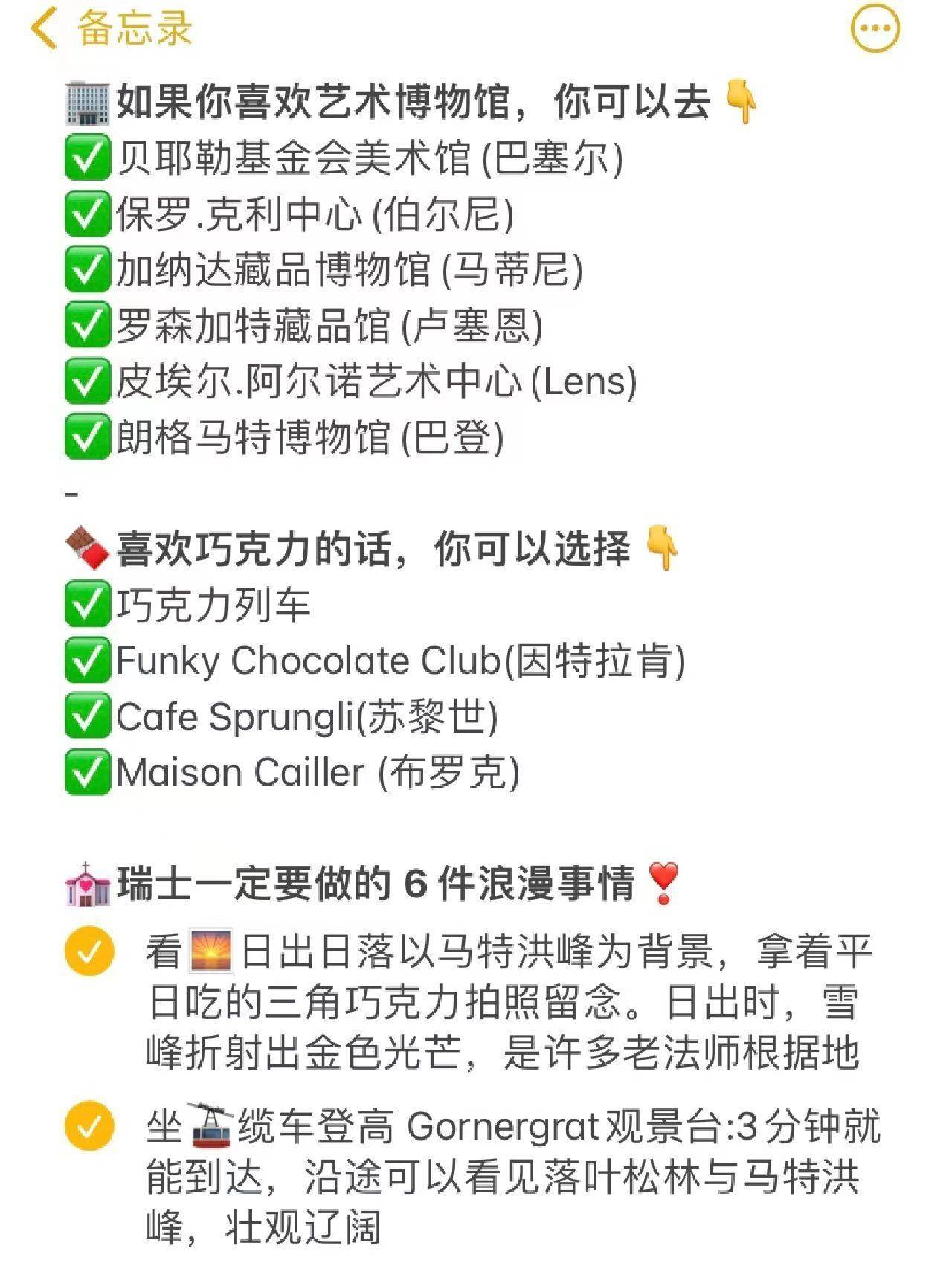 - 巧克力推荐:巧克力列车、Funky Chocolate Club(因特拉肯)、Cafe Sprungli(苏黎世)和Maison Cailler(布罗克)。