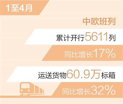 记者从中国国家铁路集团有限公司获悉:今年1至4月,中欧班列累计开行5611列、运送货物60.9万标箱,同比分别增长17%、32%,重箱率100%。其中,4月单月开行1459列、运送货物16万标箱,同比分别增长25%、45%。