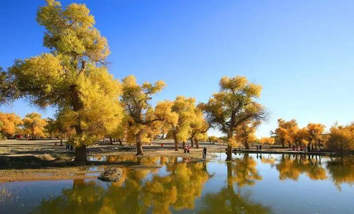 秋天是游览胡杨林的最佳时间,因为所有的树叶都会变成金黄色,装点沙漠和河岸是一个真正的仙境。
