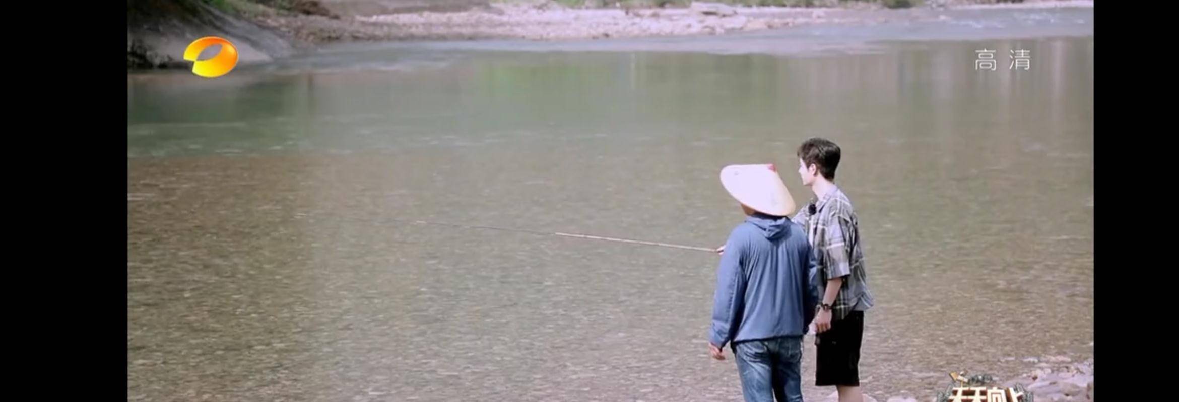 到河边冰西瓜的时候,看到有老师傅在钓鱼,一博新生羡慕,也尝试了一下,只不过可惜没带钓鱼竿,就用老师傅的鱼竿体验了一下,像个谪仙人一样。