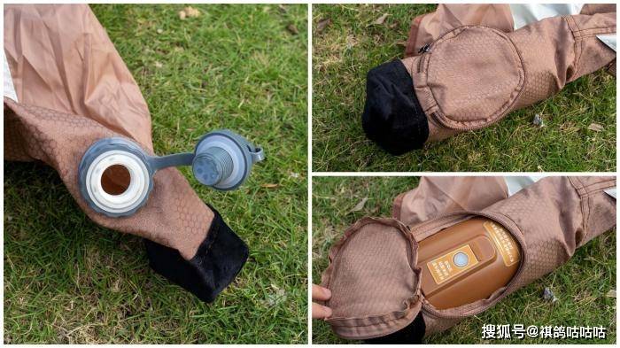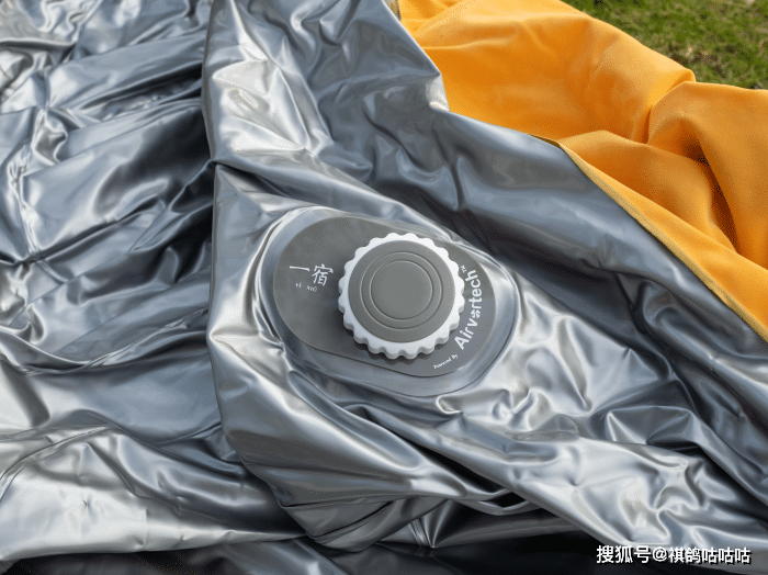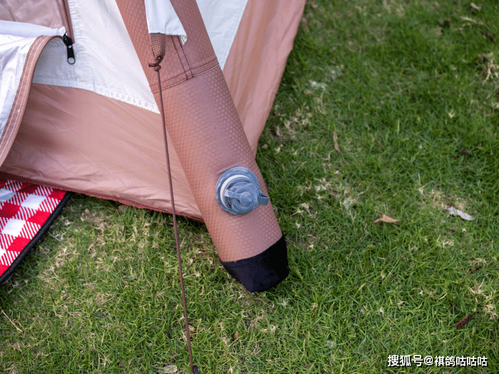 棕色部分是帐篷的四根气柱,其中三根上面都有放气口,而有一根气柱上面是充气泵,上面有一些提示,有一个带密封盖的TypeC接口和一个充气键,只要一摁就自动充气。一宿的充气泵运用的是aerogogo气泵技术,运行更高效和稳定。