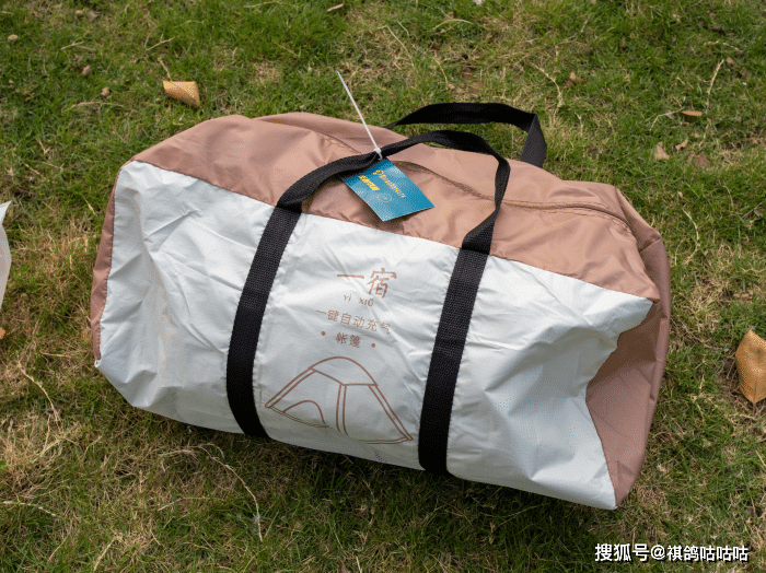 一宿的自动充气帐篷有一个棕色米白色配色的收纳袋,这个配色不错,上面有一宿的字印,还写着一键自动充气帐篷,还有黑色的手提带方便手提。