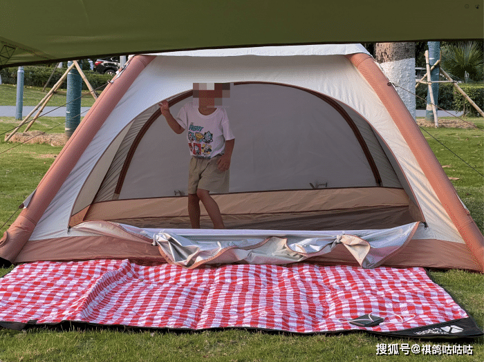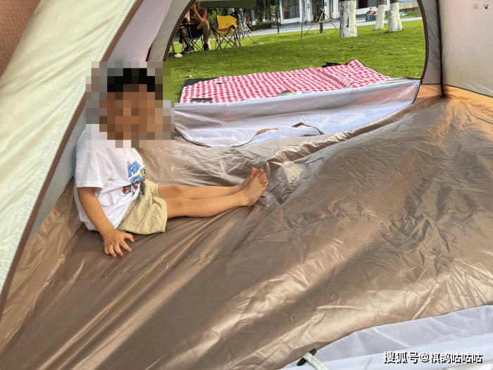 打开帐篷平铺在地面上可以看到像一个方框,里面有个叉(棕色),这是帐篷的气柱。帐篷的尺寸内部是207cm*207cm*122cm,外部是210cm*210cm*136cm,还是非常大的。