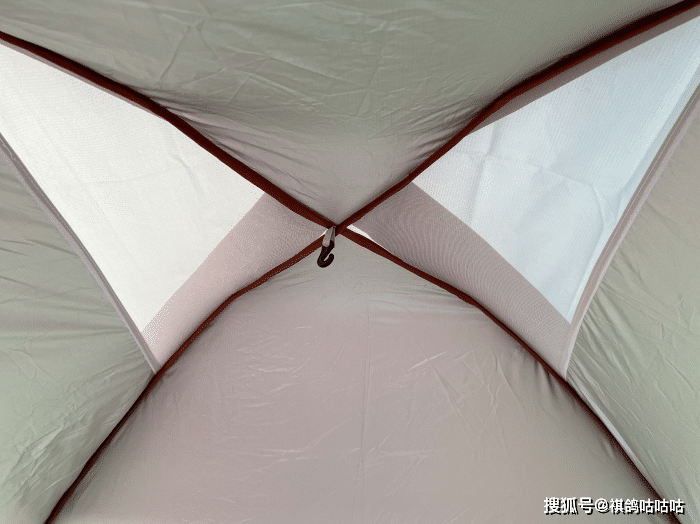 帐篷顶部是透气的,所以需要一张顶帐用来防雨,只要4个角勾上挂钩就行。可以看到帐篷内部还有一个挂钩,可以挂上一个小灯用来照明。