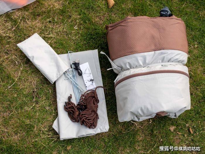 打开包装可以看到帐篷可以收得非常小,通过一根绳子绑住,旁边是顶帐、8根风绳和8根地钉,一根TypeC充电线,通过PE袋收纳,还有一份说明书。