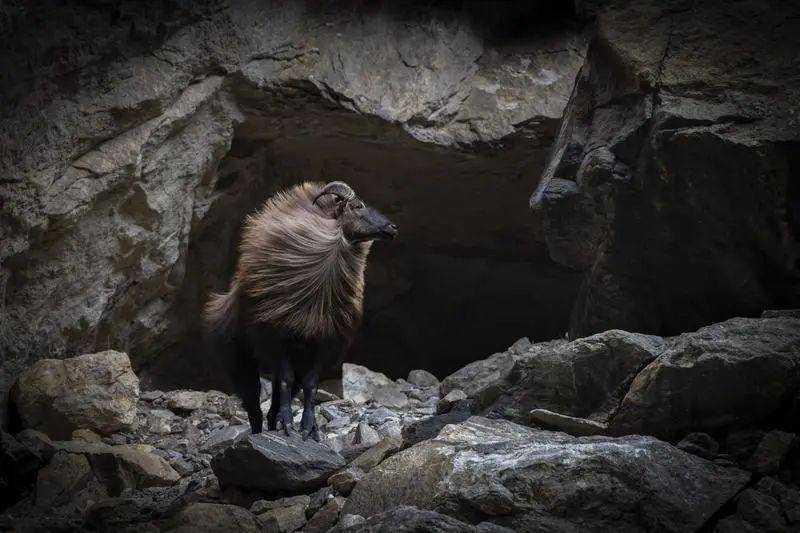 拍摄发现雄性成年塔尔羊喜欢站在峡谷悬崖高处的峭壁享受风浴。拍摄者 彭建生