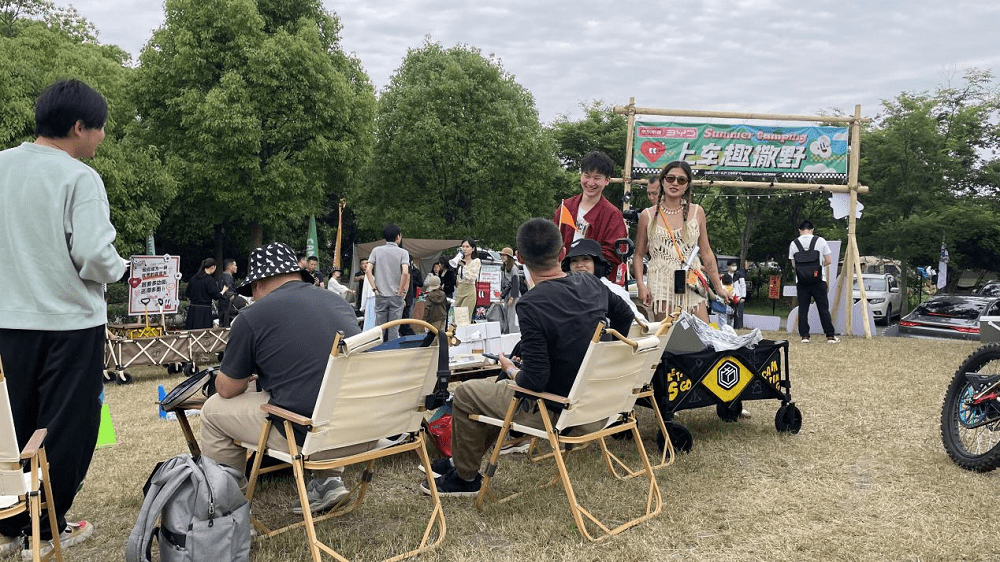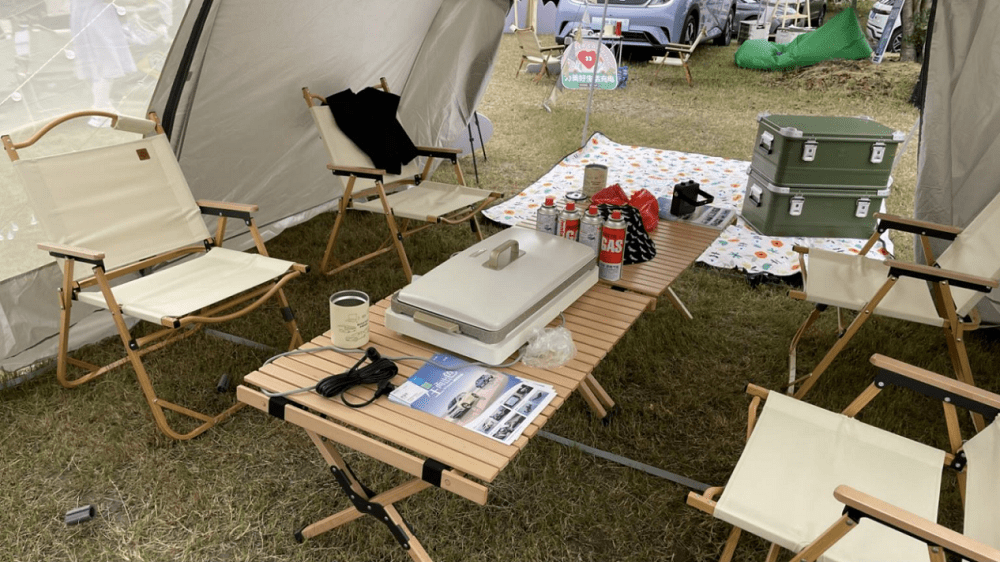 整个露营地的氛围,在一台台新能源车和奶白色帐篷、户外休闲椅、行李箱、露营车等物品的装饰下,看起来很有年轻时尚的气息,沉浸式的露营场景氛围感拉满。