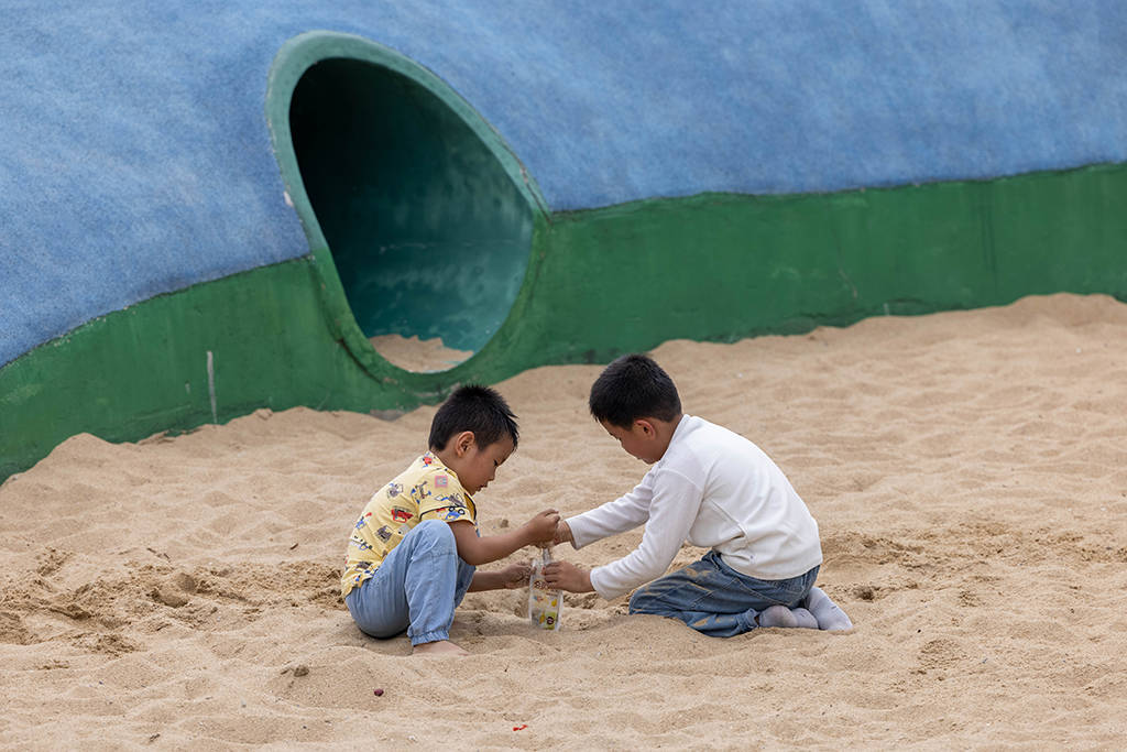浙江省舟山市定海区小沙旅游区,小朋友在玩耍。