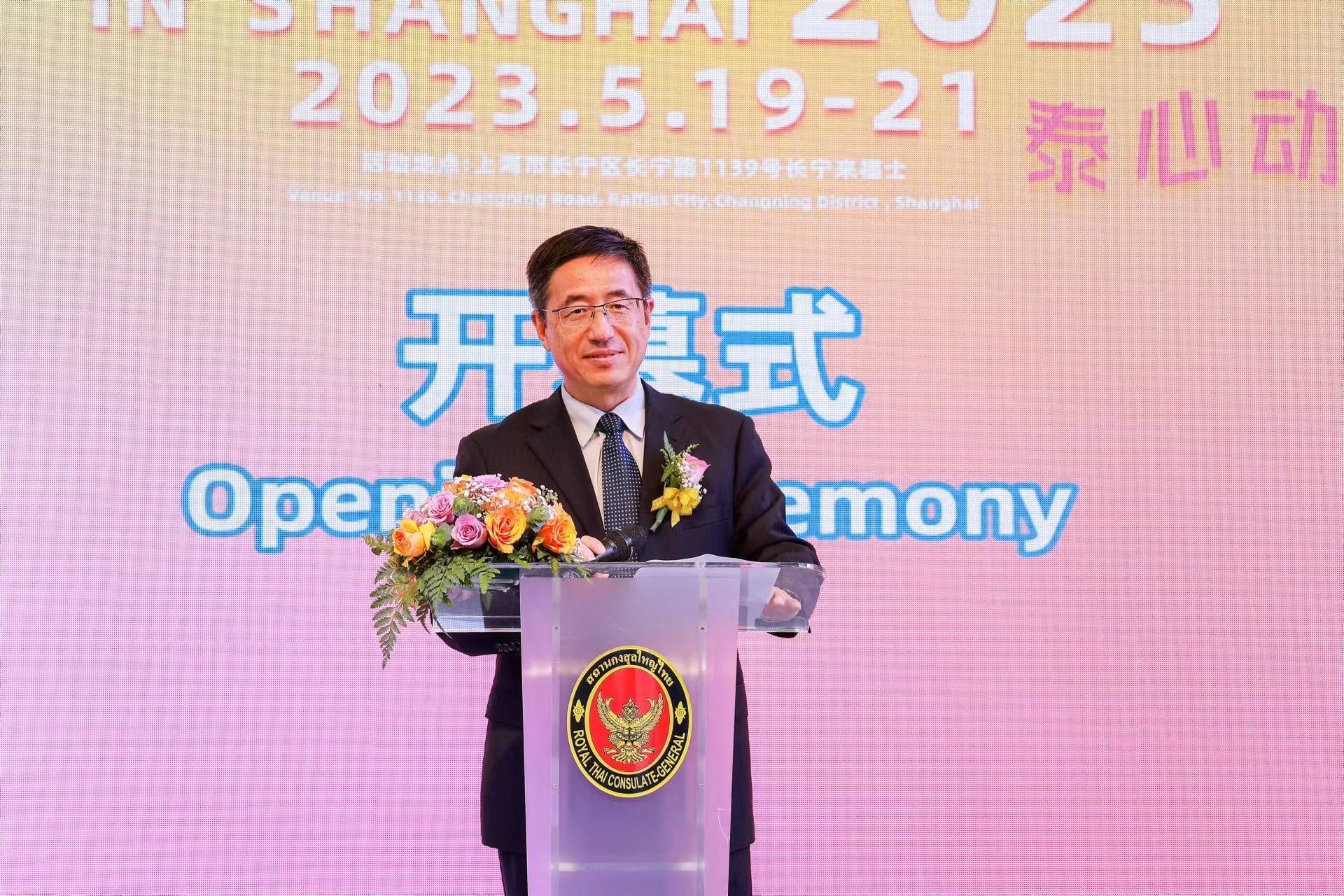 泰王国驻上海总领事馆代总领事曾伟杰先生出席开幕式并致辞。他表示,中国是泰国最亲密的友好国家之一,在全领域都有着密切的合作。自从恢复国际旅行条件后,泰中双方持续保持互访,成果丰硕。