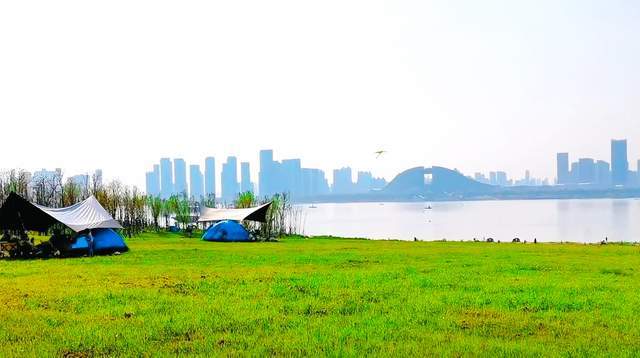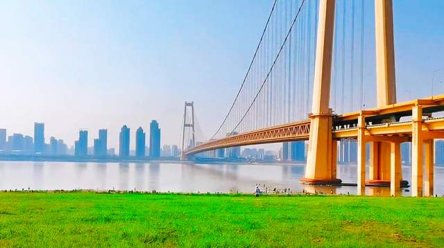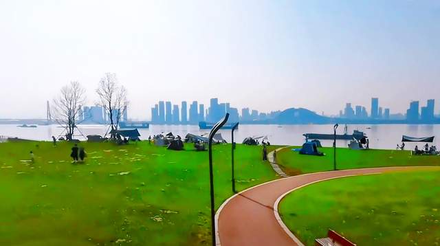 到洪山江滩打卡,平整且辽阔的草坪区一定不能错过。草坪区建在北边近杨泗港长江大桥的区域,南北跨度很大,虽然不能用一望无际形容,但辽阔的感觉还是非常明显。这边近处的草坪,地势平整,向前拓展到江边,有些许下沉,草坪于是很快和不远处的江水平面接驳在一起。组成的画面里,草坪是静止的绿色,江水是摇晃的晶莹色,倒映着城市轮廓,显得十分热闹。而以大桥为背景,草坪水平像绸缎,反差之大,像是云里雾里,拍照看来,非常精美。