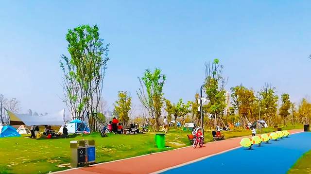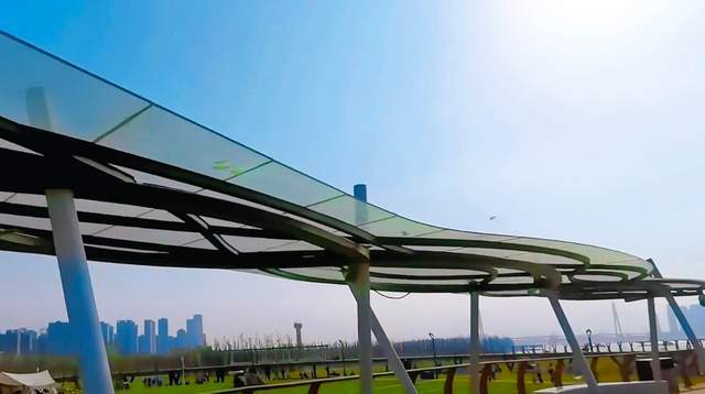 与草坪在一起的,还有江滩上的观景台。说是观景台,更像是一座弯曲的虹桥,它的规模不大,但因为本身的设计,带些弧度,以草坪区向南拓展。游客走上桥,坡度逐步扩大,看到的桥下风景,草坪是纯平的状态,江水忽高忽低,而大片的植被,像是绿色的海洋,马上就要和江水融为一体。偶尔也能听到孩子们的欢笑声,他们围着绿道在跑,心中充满欣喜。