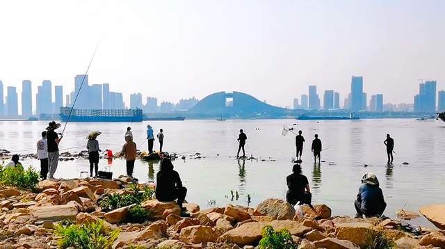 自然绿化带上游玩的人多,江滩砂石靠近水岸的地方人也不少。四五月的季节,正是垂钓的好时候,于是总有钓友带着简易装备,猫在砂石边上。钓竿不长,鱼线轻飘,一坐就是大半天,不知道有没有渔获,完全一副姜太公钓鱼的佛系状态,令人十分羡慕。坐在砂石上,也能看到近在咫尺的江水,一浪浪推过,沿着波纹起伏,不远处是繁忙的江上运输,汽笛声声,十分遥远。
