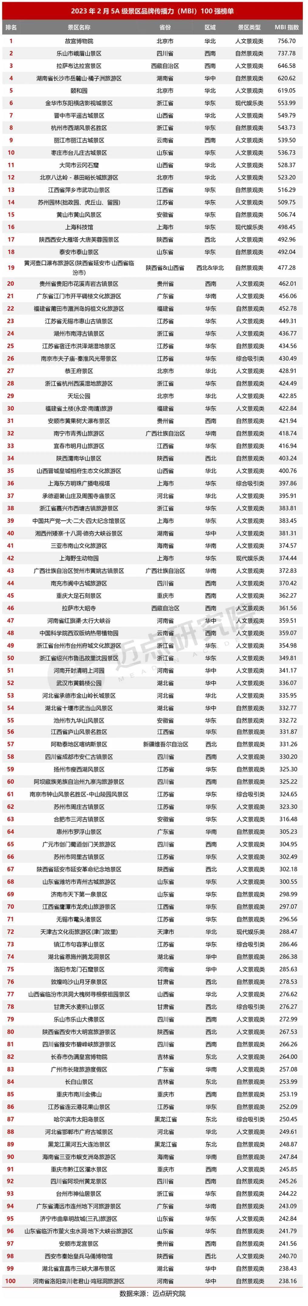 2023年最新全国5A级景区品牌传播力百强榜来了,随着气温升高,旅游业复苏进程进一步加速,文旅消费正出现较大幅度反弹。迈点研究院从搜索、媒体、运营、点评四项指数出发,评选出全国5A级景区top100!快来看看清明可以去哪里玩吧。后附top100完整榜单!