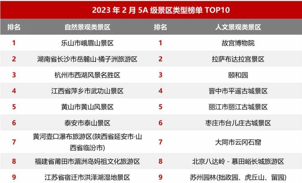 二月份,故宫博物院、乐山市峨眉山景区、拉萨布达拉宫景区、湖南省长沙市岳麓山·橘子洲旅游区、颐和园、金华市东阳横店影视城景区、晋中市平遥古城景区、杭州市西湖风景名胜区、丽江市丽江古城景区、枣庄市台儿庄古城景区跻身榜单前十。