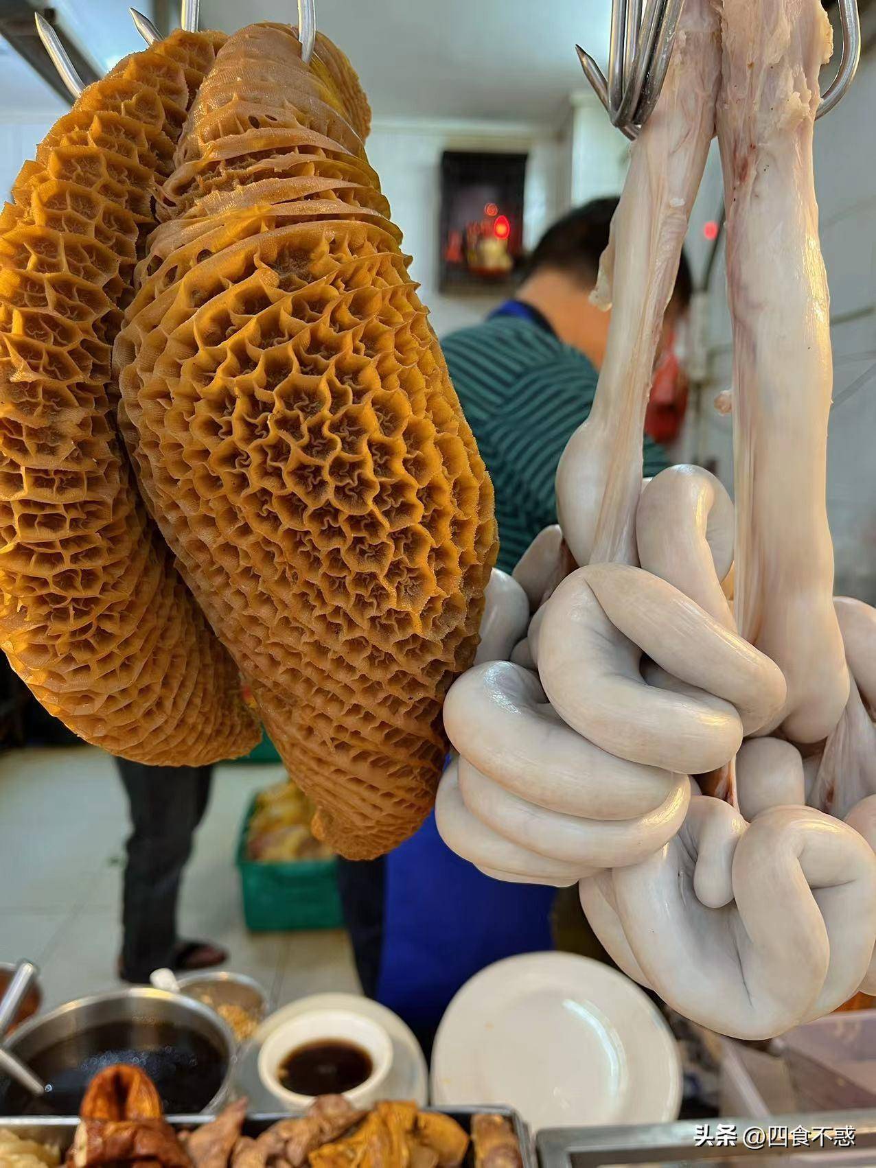 店里挂着金钱肚和生肠颇为震撼。这些下水都是熟的,属于白切类的美食。
