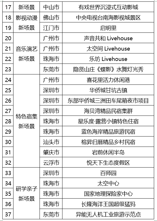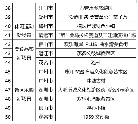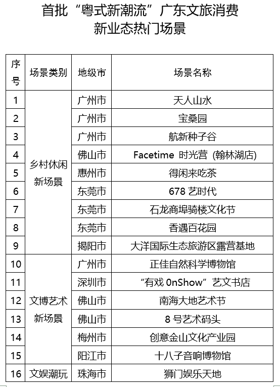 经各地市文旅部门推荐及社会公开征集,广东省共申报了213个文旅消费新业态热门场景,涵盖乡村休闲、文博艺术、文娱潮玩、影视动漫、音乐演艺、特色宿集、研学亲子、休闲运动、美食品鉴、街区乐购等十个类别。经推荐申报、材料审核、网络票选和专家评审等程序,最终确定广州市天人山水等50个项目入选首批“粤式新潮流”广东文旅消费新业态热门场景,现将名单予以公布,详情如下。