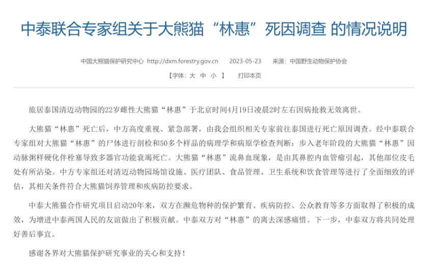 5月23日,中国野生动物保护协会发布中泰联合专家组对大熊猫“林惠”死因调查的说明: