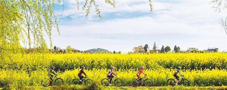 3月21日,贵州省黔西市洪水镇解放村,游客骑行穿过油菜花田,欣赏春日乡村美景,倡导低碳健康生活。史开心摄(中经视觉)