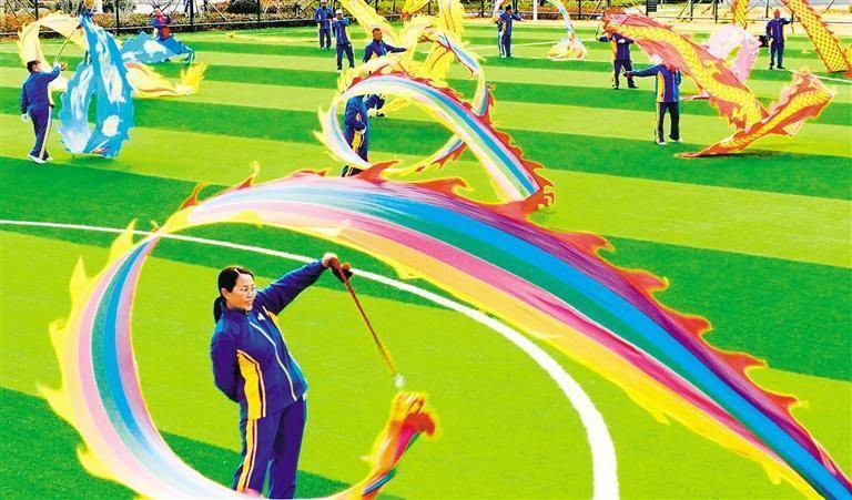 3月24日,山东省东营市东营区体育公园,市民舞动“彩带龙”。春暖花开,人们纷纷来到户外开展各种体育活动,挥洒汗水,愉悦心情,快乐健身。