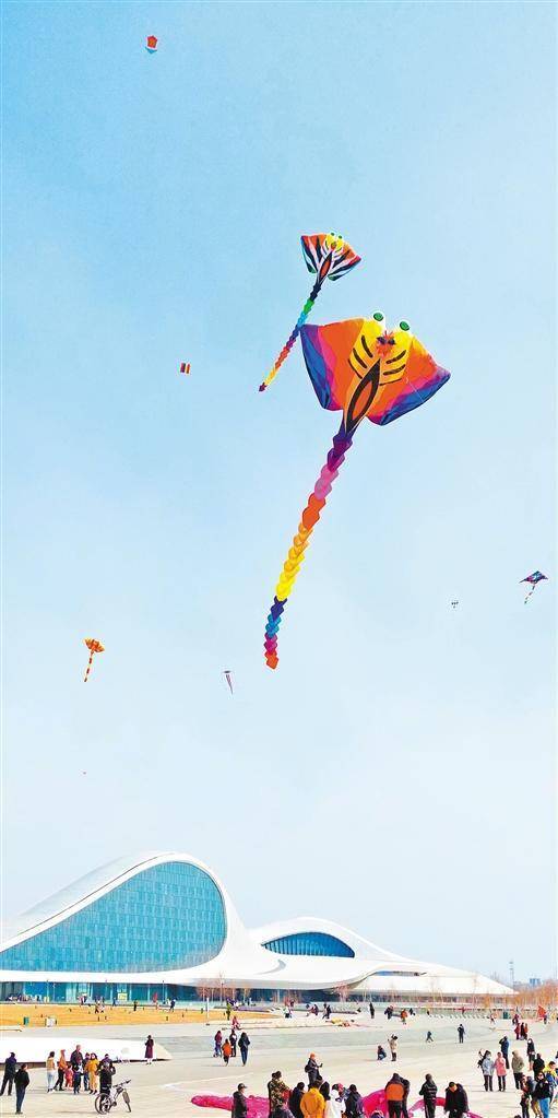 3月26日,风筝爱好者在黑龙江省哈尔滨市大剧院前放飞风筝。兼具体育休闲和传统技艺的风筝,受到越来越多百姓的喜爱。刘 洋摄(中经视觉)