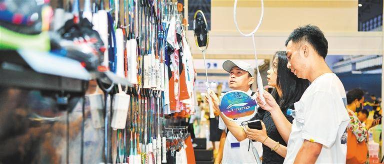 3月25日,观众在海南省海口市举办的第二届中国(海南)体育用品和装备进口博览会上了解羽毛球器材。
