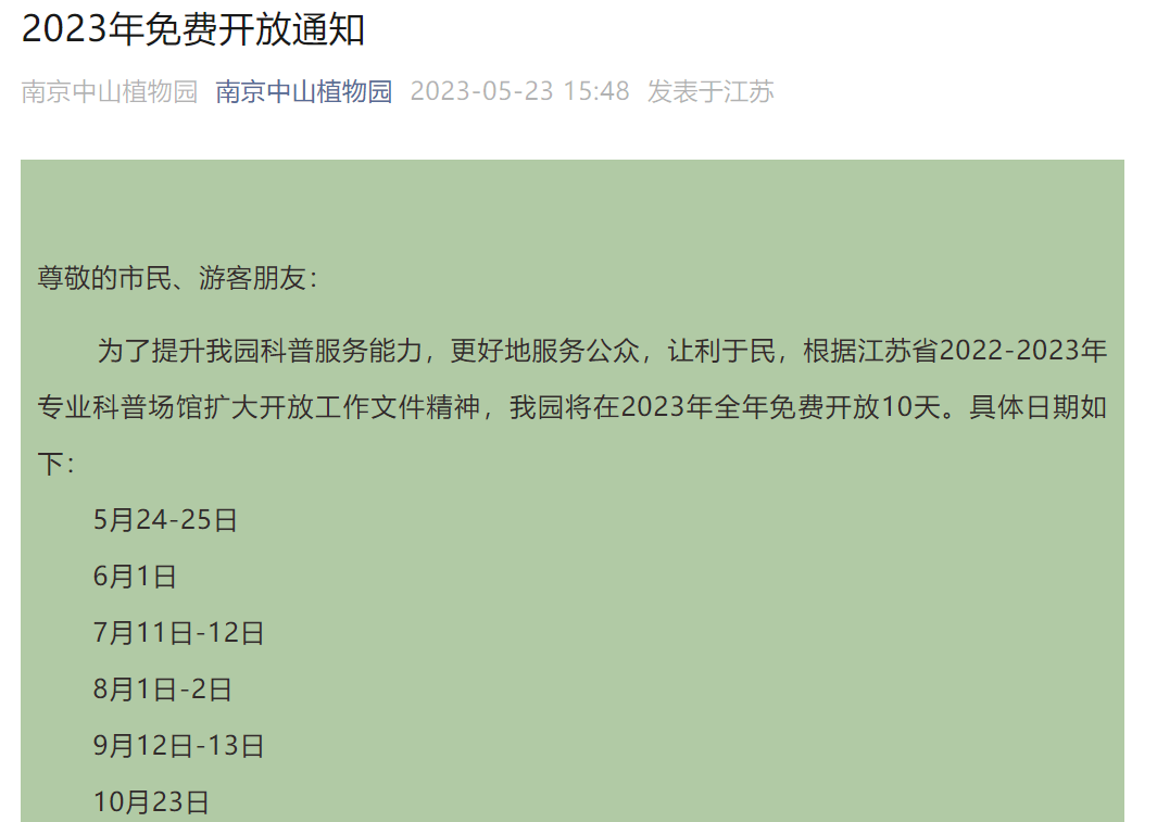 央广网北京5月23日消息 据南京中山植物园官方微信消息,根据江苏省2022年-2023年专业科普场馆扩大开放工作文件精神,南京中山植物园将在2023年全年免费开放10天。
