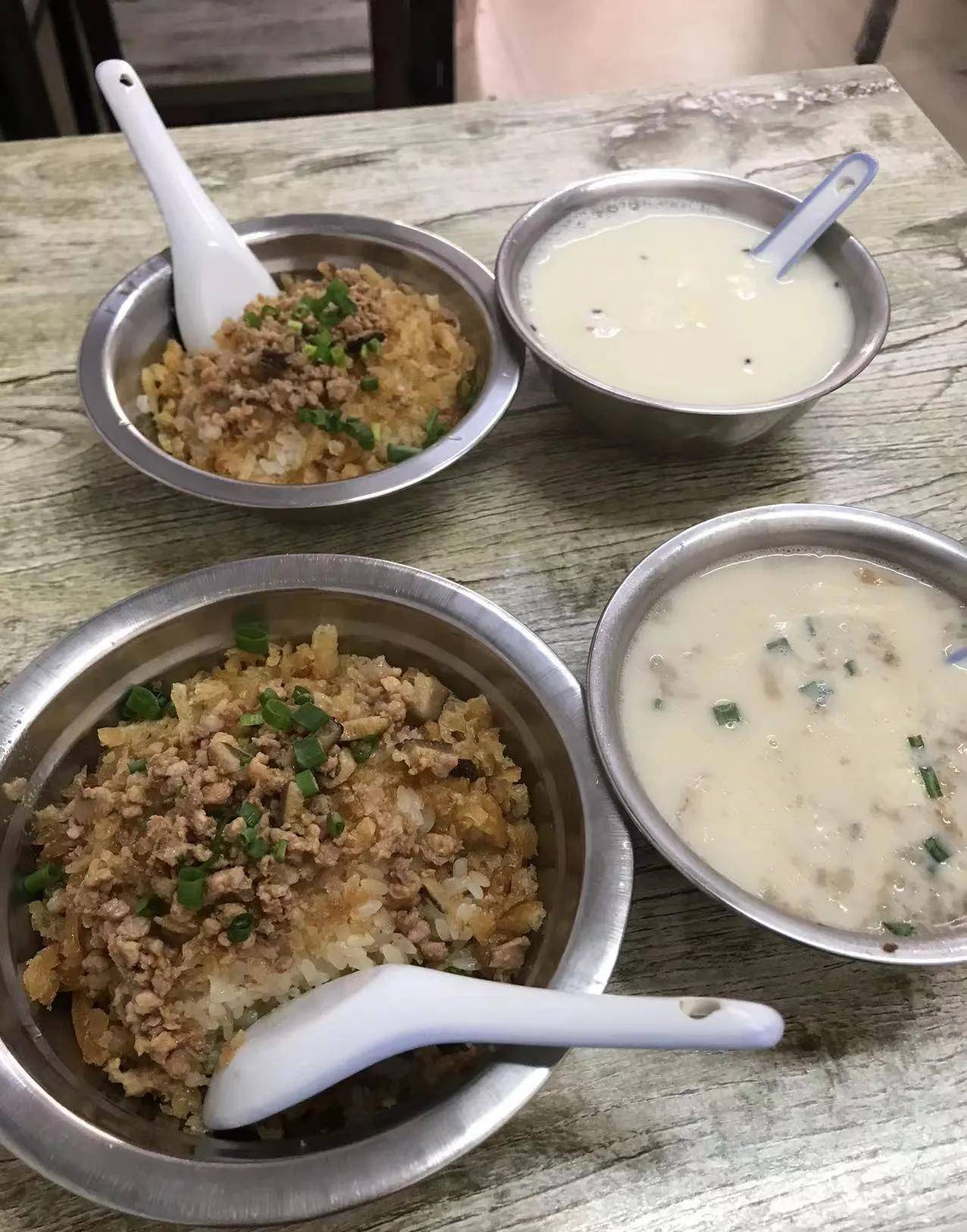逛五马街,吃温州特色糯米饭,吃过很多糯米饭,第一次吃这一款的。我老家是糯米饭包油条 ,现在也有包这种菜的, 温州的是油条剁碎再加肉沫汤拌起来吃 别有一番风味!小碗7元,再加一碗豆浆2元,吃饱喝足。来温州的旅游推荐品尝。
