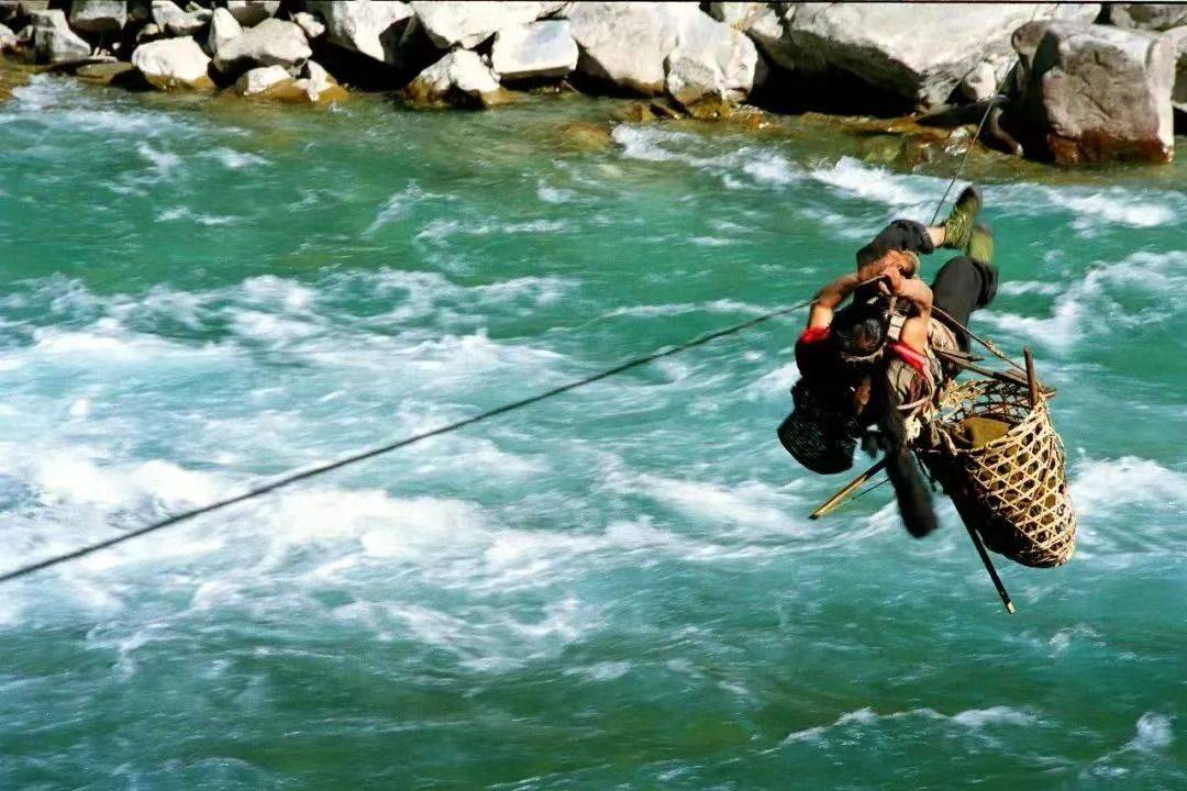 在交通不发达的年代 ,当地人用背包带兜住腿根儿与腰部,在身前打个结,再用一个带钢勾的滑轮,将自己整个吊在钢索的一端,然后就抱着孩子或拎着麻袋向对岸溜去。顽皮的孩子甚至还头朝下、腿朝上地在半空中表演起“特技”。只要你有足够的勇气,也可以体会一下江水在自己身下滚滚而去的惊心动魄。