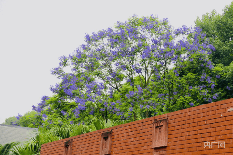 蓝花楹和红墙交织如画(央广网发 重庆园博园供图)