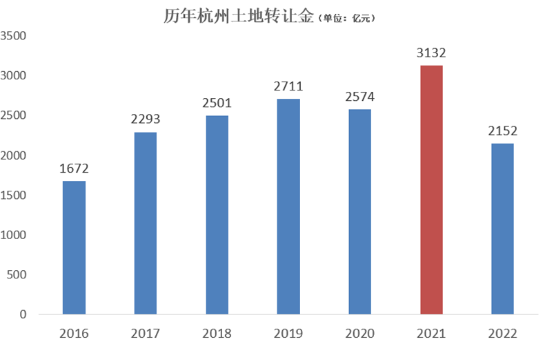 参考下面这张图,自2017年来杭州没有一年的土地转让金低于2000亿元,2021年甚至突破了3000亿的大关。2017-2019连续三年杭州的土地转让金位居全国第一。