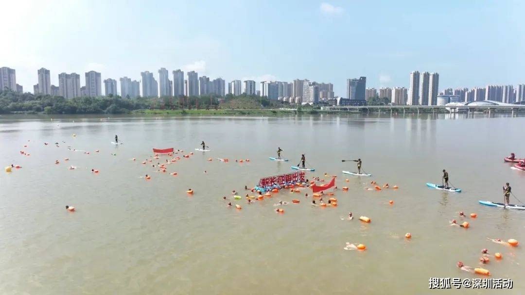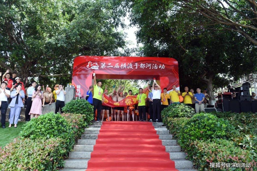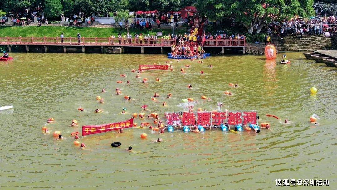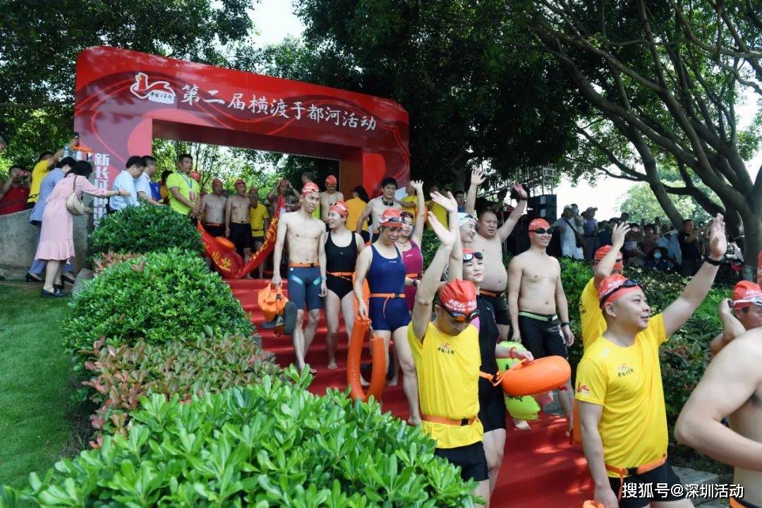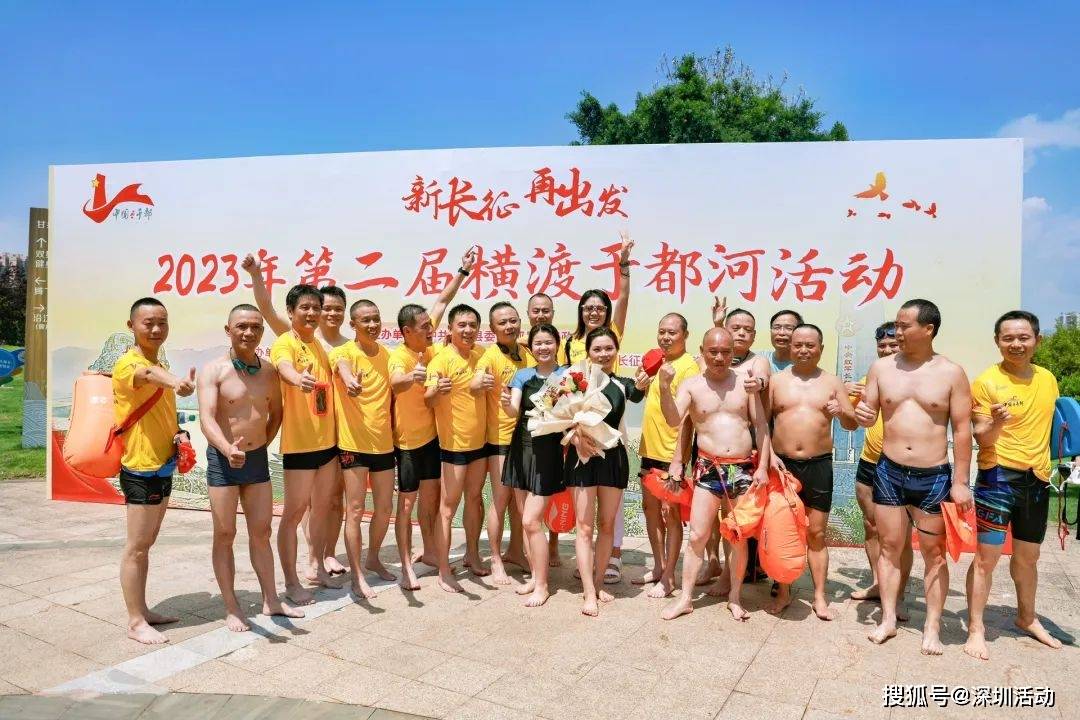 启动仪式后,首批近千名来自粤港澳大湾区及江西本土的游客,按照当年中央红军从东门渡口集结长征出发的线路横渡于都河,开启初心之旅。随着一声鸣笛,游泳爱好者们身穿泳衣泳帽及救生用品从长征渡口下水,奋力向对岸游去。橙色的泳帽伴随着飞溅的水花绵延在江面上,蔚为壮观。半个小时后,选手们陆续成功渡河。