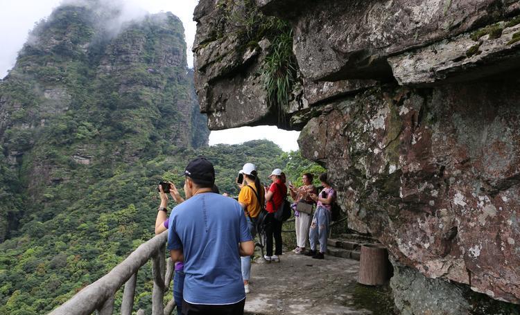 5、圣堂山:位于来宾市锦绣县境内,海拔1979米。由泥盆纪紫红色砾岩和砂岩组成。经过自然力和地表水的长期侵蚀、切割、风化,崩解成丹峰高挺、竹崖直立、棱角分明、沟壑深邃的大药山丹霞。塔柱的地形具有刚性边缘和斜面。